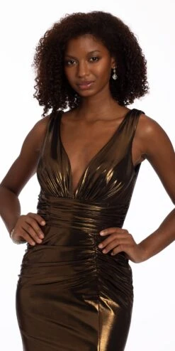 Plunging Metallic Glitter Lace Fit And Flare Dress With Pockets
