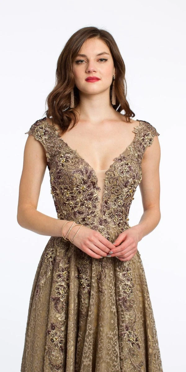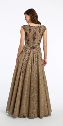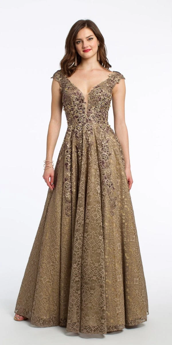 This sophisticated and romantic ball gown dress was made for a beauty queen! Elevate your mother of the bride dress style with a plunging neckline, capped sleeves, an appliqué fitted beaded bodice and illusion back. Complement the detail with mid-heel strappy sandals, multi-stone earrings and a gold clutch.