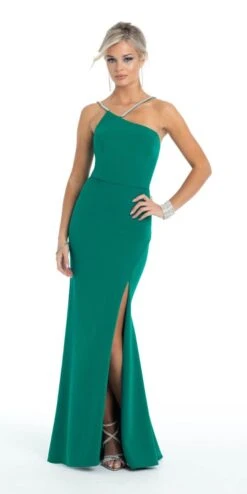 Your perfect mix of simple and stunning! This Asymmetrical One Shoulder Rhinestone Scuba Dress with Side Slit features an asymmetrical neckline with rhinestone straps, fitted bodice, semi open back, and column skirt with side slit. Take this style to prom, an evening event, or wedding. Add some sparkle with silver accessories!Â