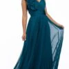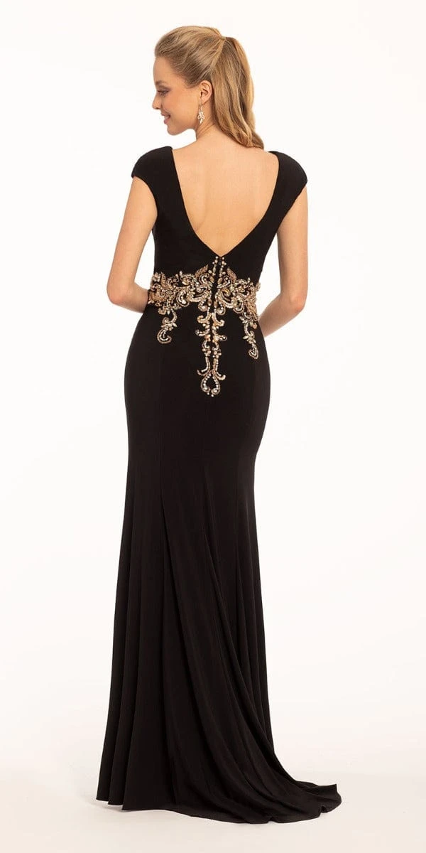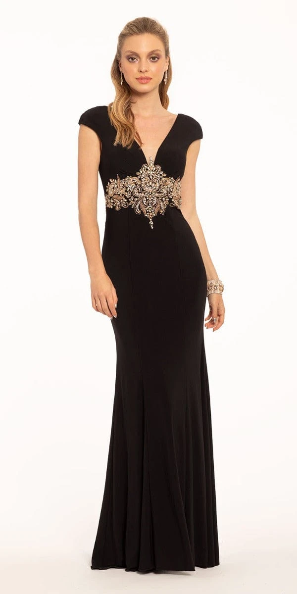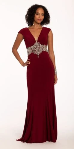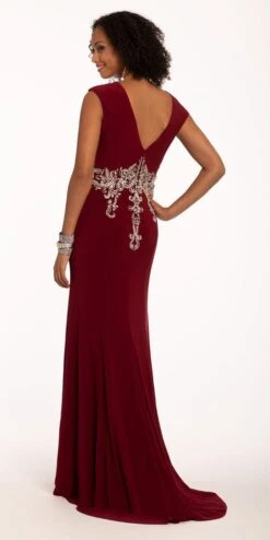 The ultimate in evening dresses is here and ready for you to show it off at your next big event! We love a classic style that incorporates modern designs like a low V back and jersey knit fabric for a comfortable and sexy fit! The long evening dress uses capped sleeves and a beautifully embellished empire waist to keep classic style features alive and well. To compliment the sparkling empire waist, we suggest a reflective bracelet that will capture its shine and a sleek clutch to top it all off.