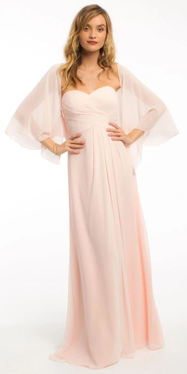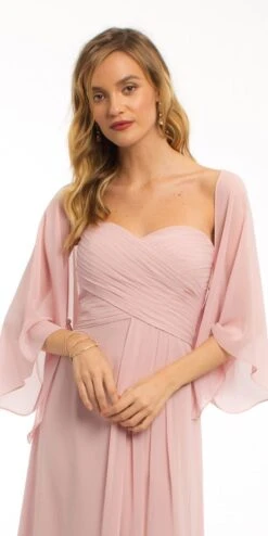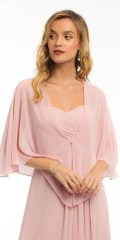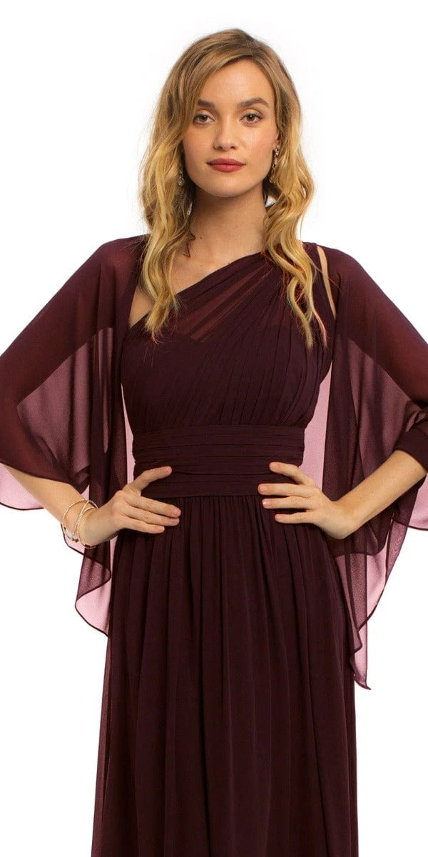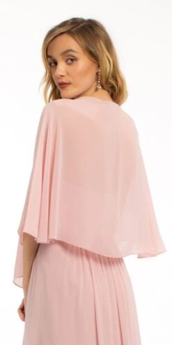 Fashionable for formal events or over a bridesmaid dress, this chiffon cape can also be converted into a shrug. Pair this dressy separate with nude heels, a rhinestone bracelet, and a gold clutch to finish.