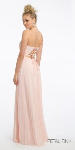 Stand by her side in stunning fashion in this gorgeous bridesmaid dress! With its v-neckline, fitted bodice, pleated skirt, and lace-up back, this evening gown is a classic choice for wedding day. Pair it with rhinestone heels, a rhinestone ring, and a satin clutch.