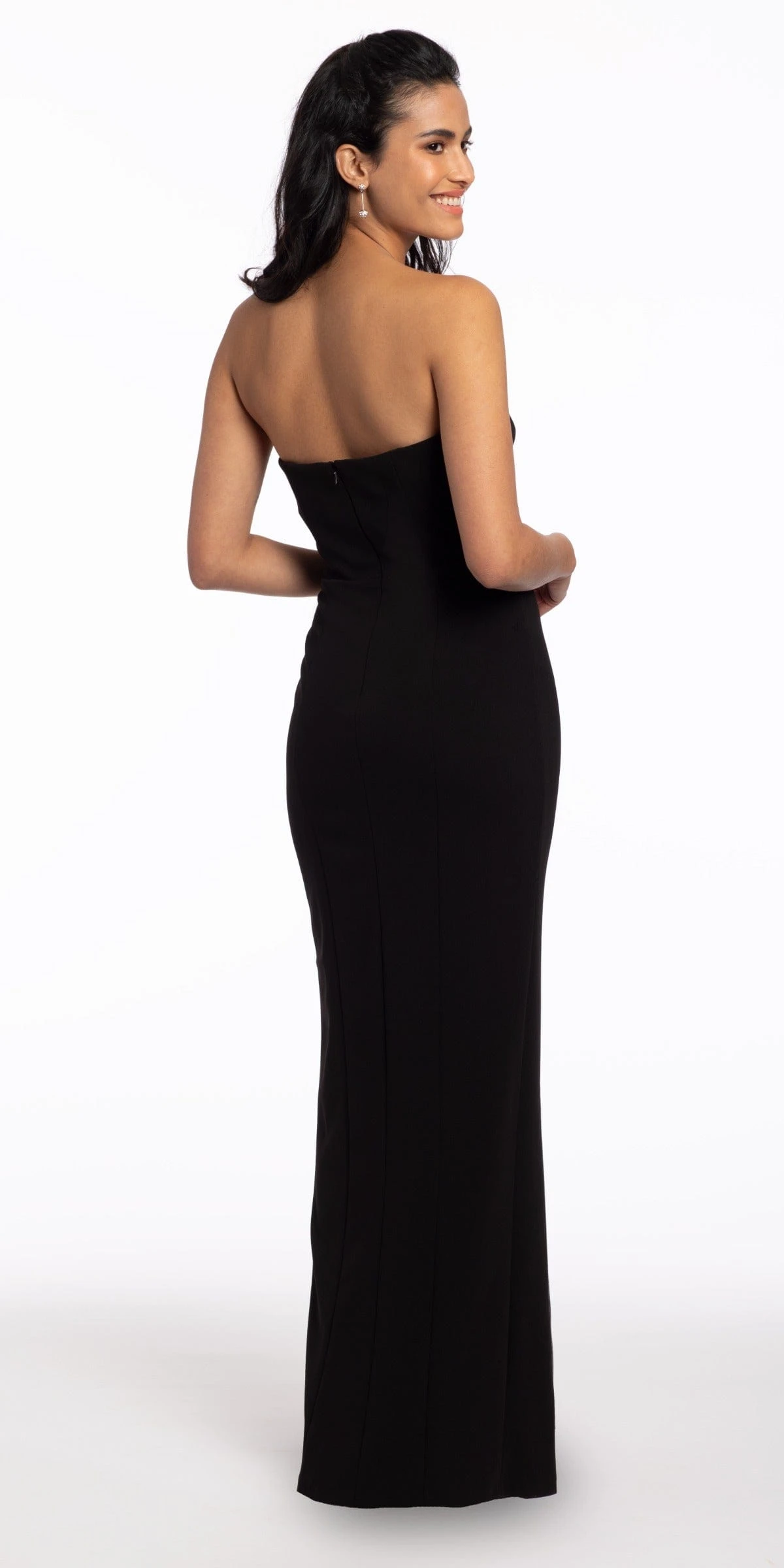 The tuxedo look but make it dressy! This Crepe Front Tuxedo Dress with Satin Lapel features a strapless neckline with tux satin laplels, fitted bodice, and sheath silhouette with side slit. The perfect style for a black tie wedding, cocktail party, or prom!