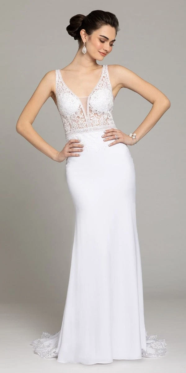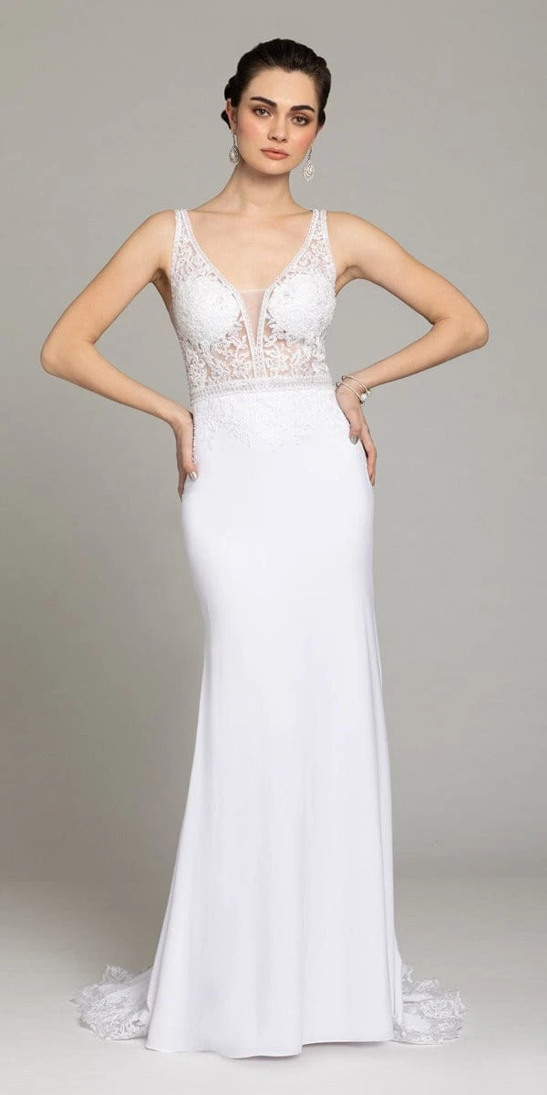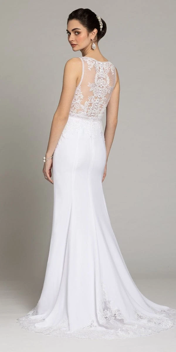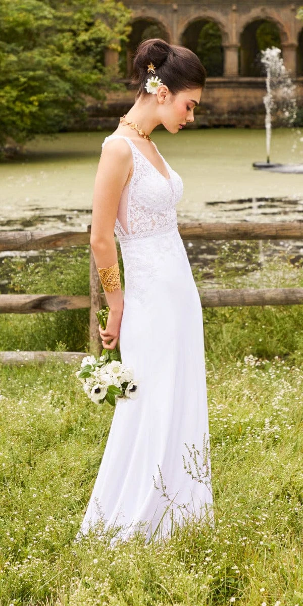 Modern bride, look no further: this sleek wedding dress may be just the fit for you! Featuring a V-neck, illusion button back, fitted lace bodice and a-line skirt, this elegant fit will flatter your curves and have you radiating confidence as you head down the aisle. Opt for elegant rose colored bridesmaid dresses in satin and crepe for the ultimate summer bridal party dress look to complement the gown.