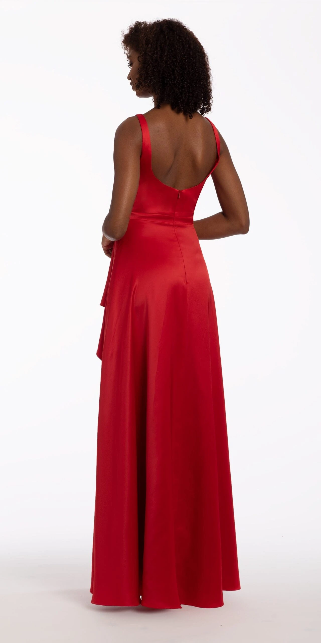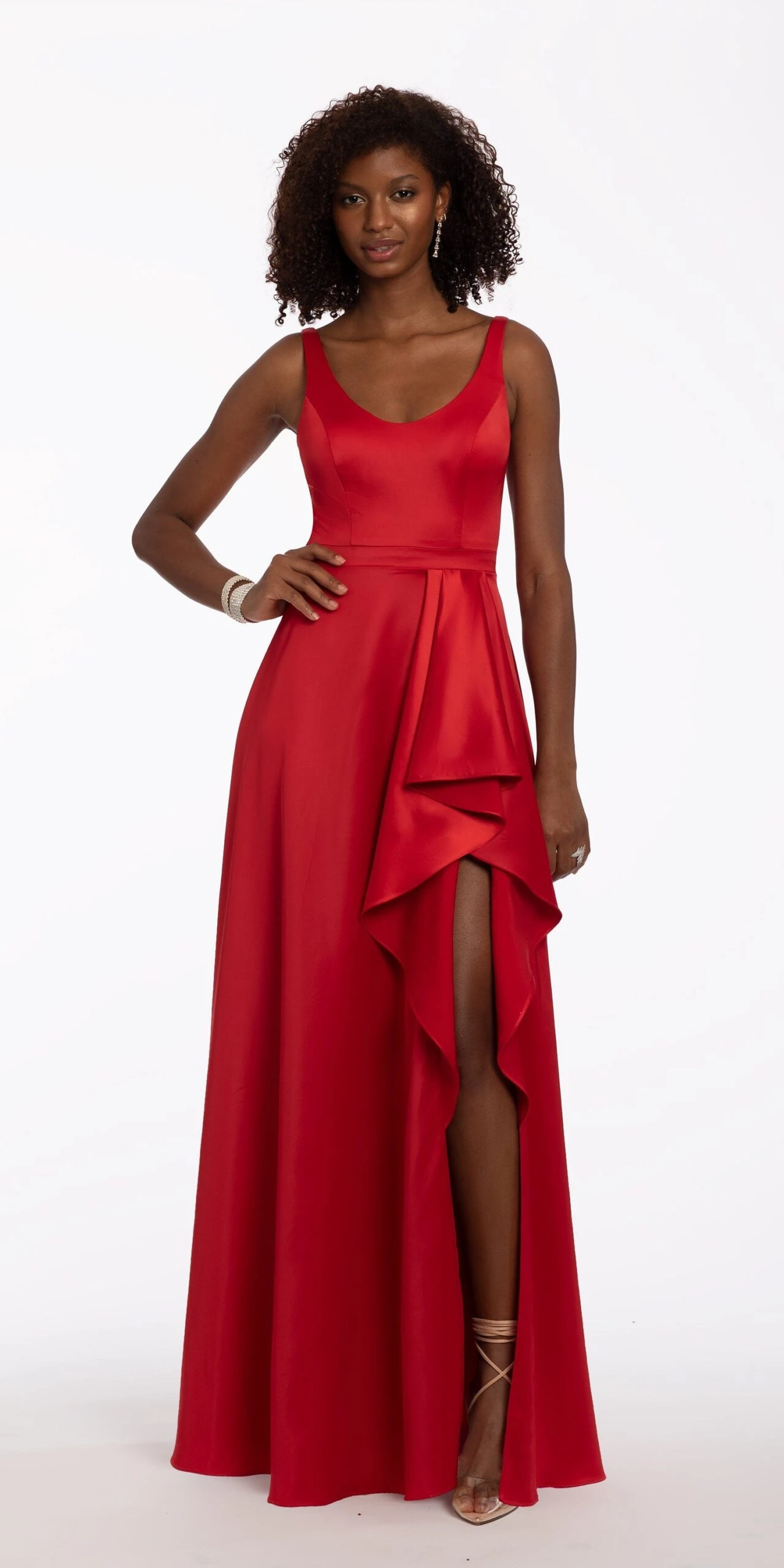 Deep Scoop Satin A Line Dress With Cascading Ruffle