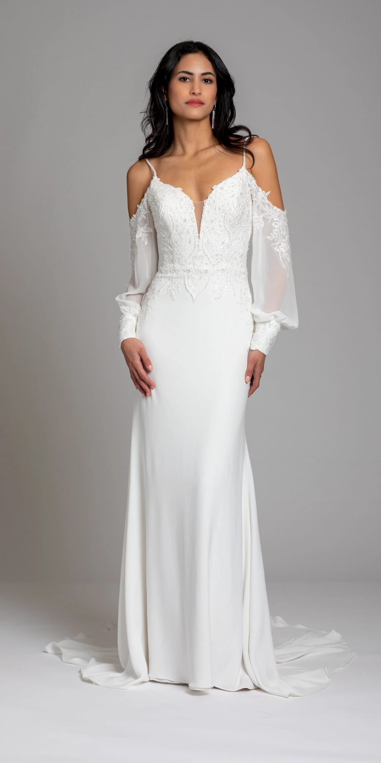 Feel light and airy in this breathtaking dress for your dreamy day. Effortless free flowing sleeves come together with an intricate embellished bodice. This style also features a plunging neckline, column style, and darling v back with sweep train. Pairs perfectly with our bridesmaid dress collection!