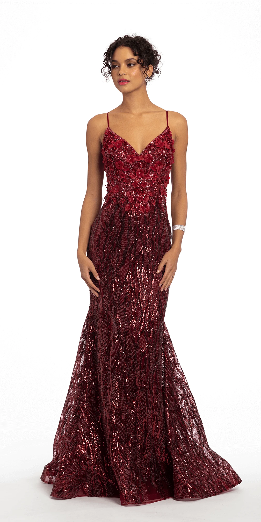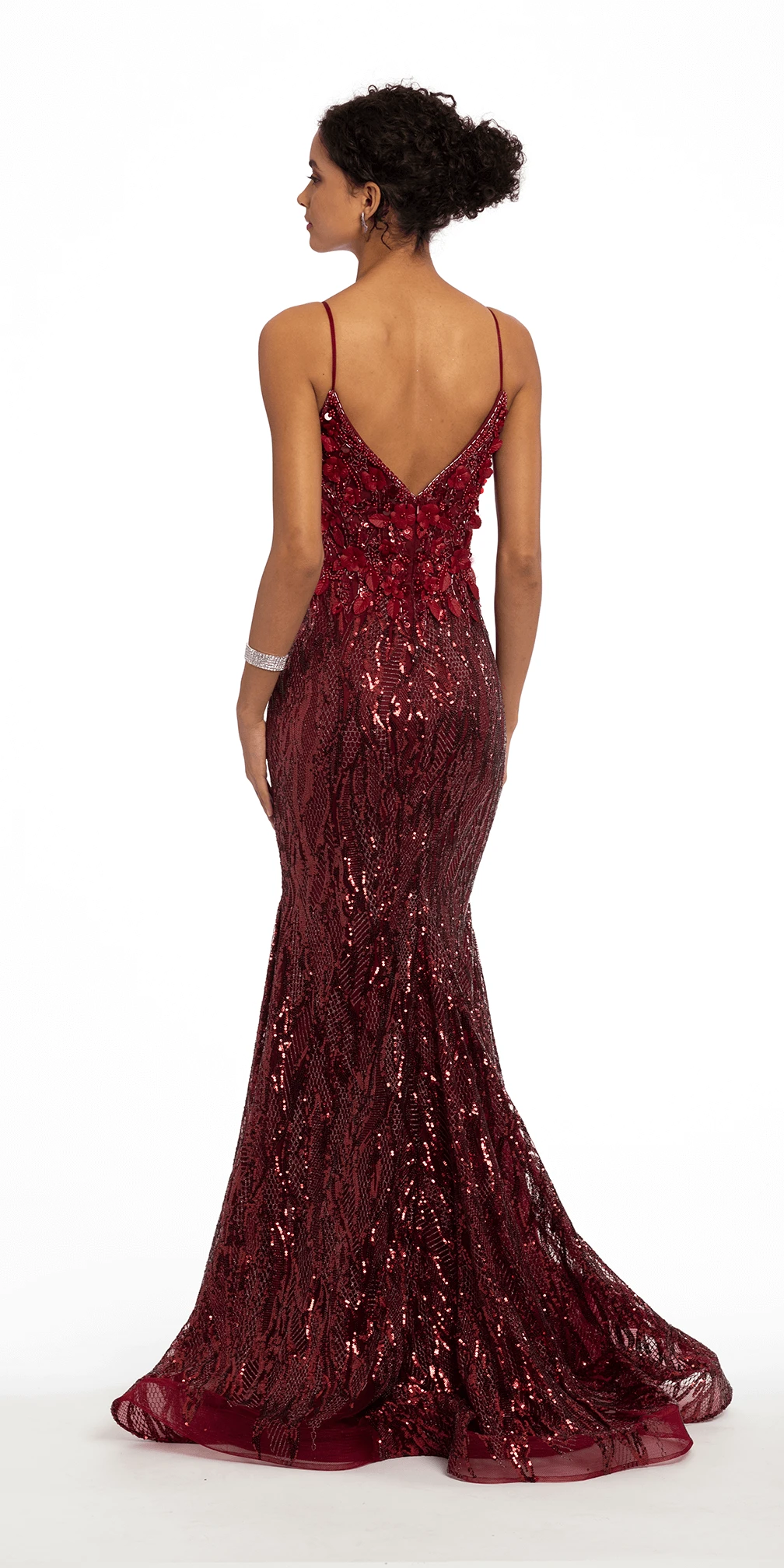 Radiant romance in this ruby red! This Embellished Sequin Basketweave Trumpet Dress with Train features a V neckline, fitted 3 D beaded bodice, mermaid silhouette, and v open back. This style is ready for its debut at prom, an evening event, or wedding. Silver accessories would pair nicely with this look!Â
