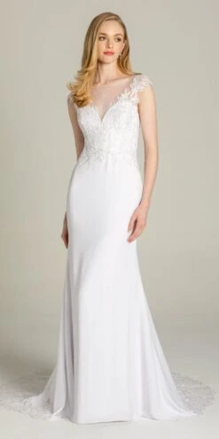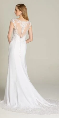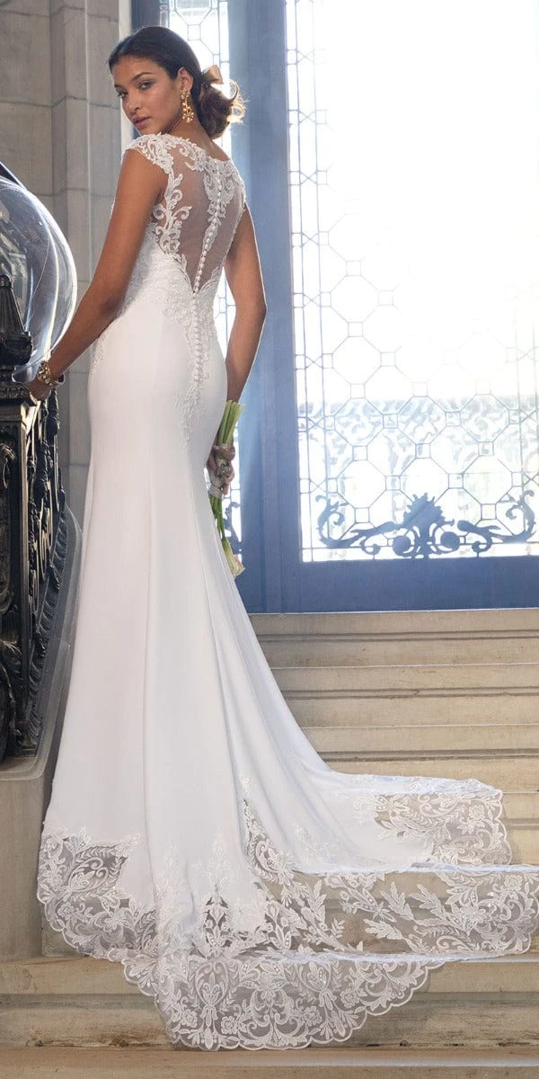 Brides, vow to wow the moment you slip into this cap sleeve wedding dress! The features of this breathtaking wedding gown include a sweetheart illusion neckline, fitted embroidered bodice, trumpet silhouette, illusion embroidered back, and crepe fabric. And she lived happily ever after…