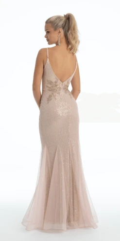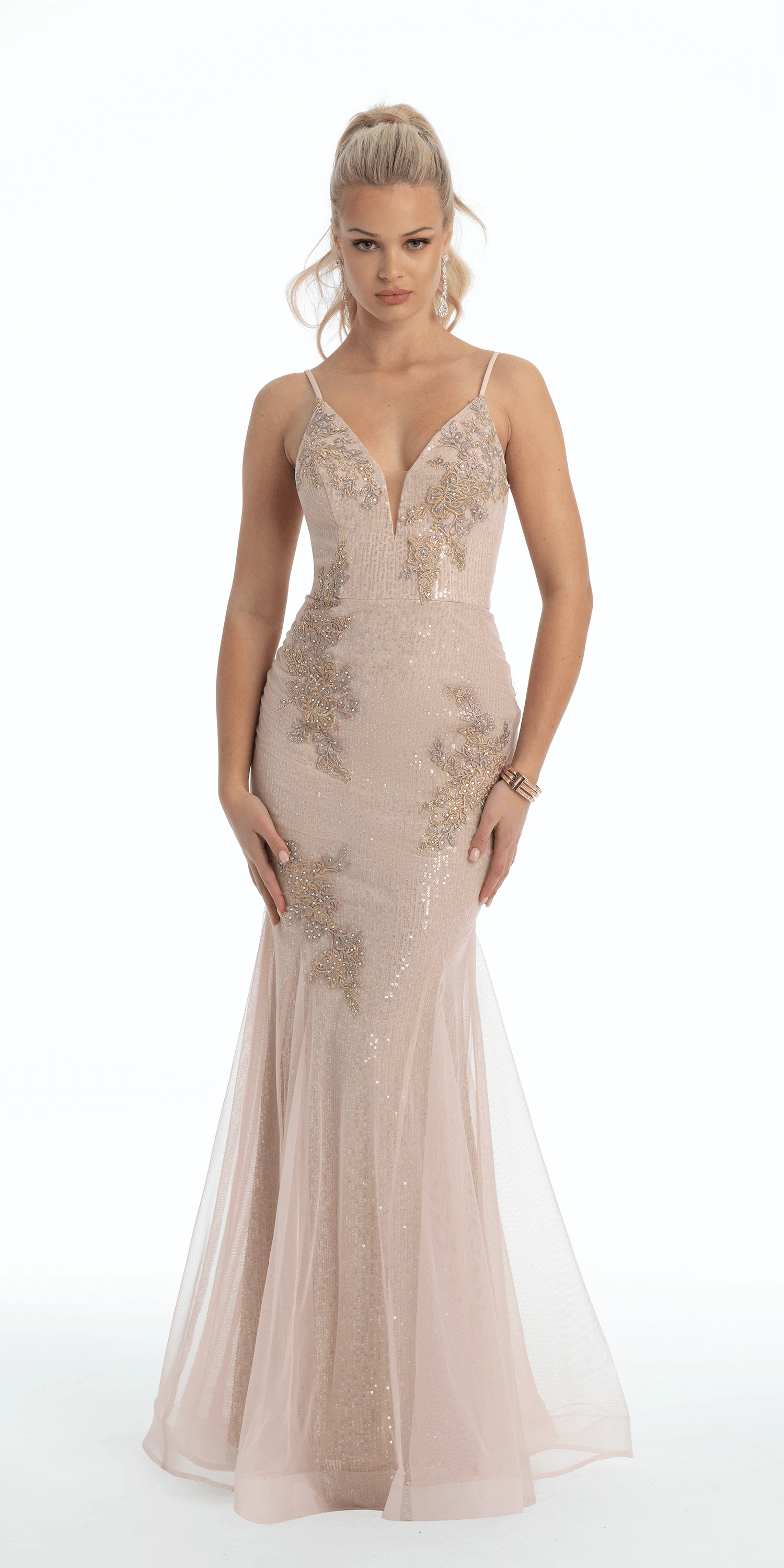 A dress to have them Blush-ing! This gorgeous style features a plunging neckline, fitted bodice, trumpet silhouette, and v open back. The picture perfect style for prom, a gala, evening event, or wedding! Pair with nude accessories to complete the look!Â