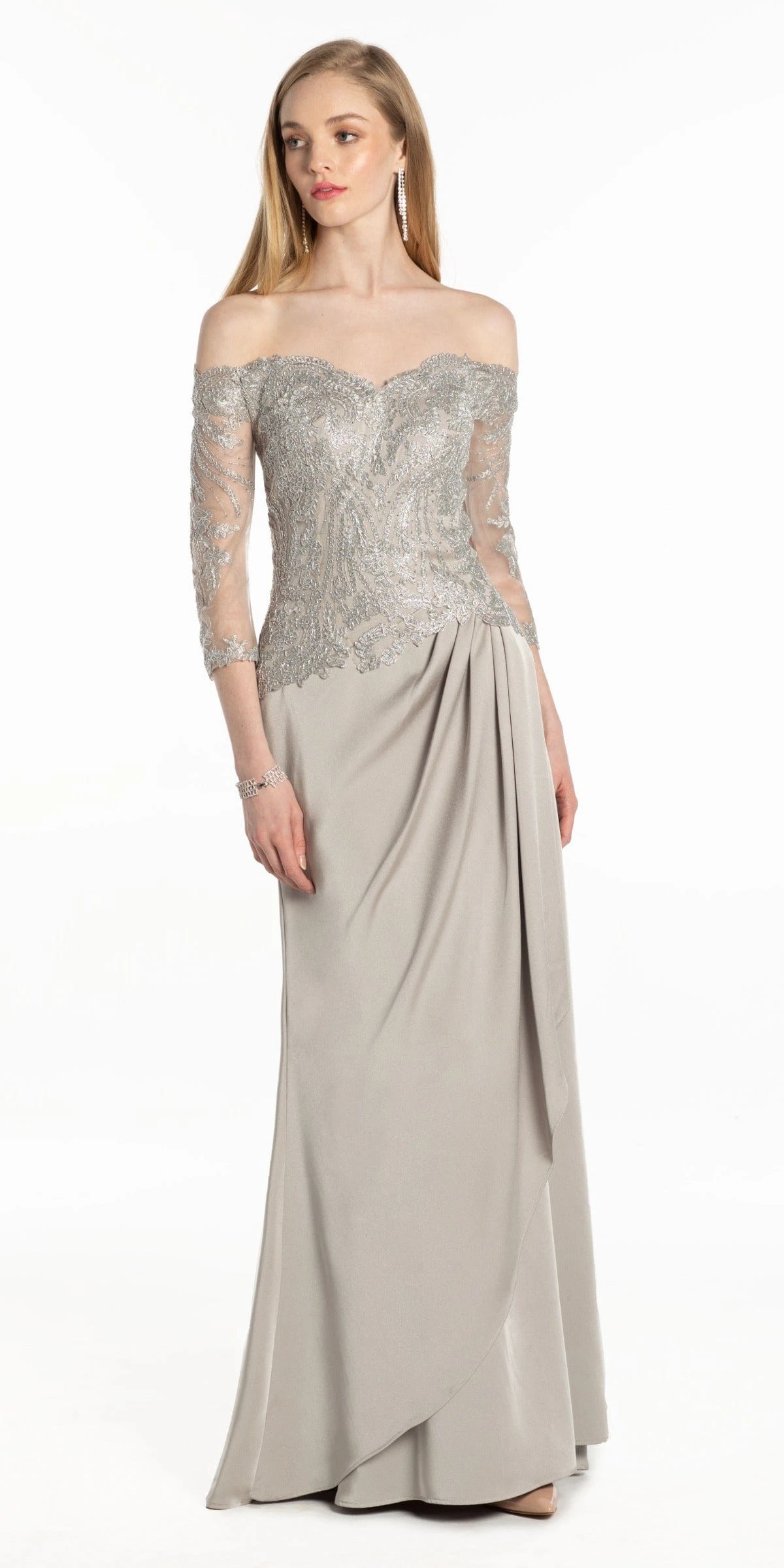 Shine like the star you are in this shiny silver dress! This Embroidered Off the Shoulder Crepe Dress With Side Drape features an off the shoulder neckline, illusion three quarter sleeves, embroidered fitted bodice, and side drape in the skirt. This style makes the perfect mother of the bride, or evening event dress!Â