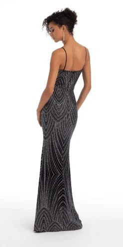 Fan Pattern Glitter Plunging Column Dress