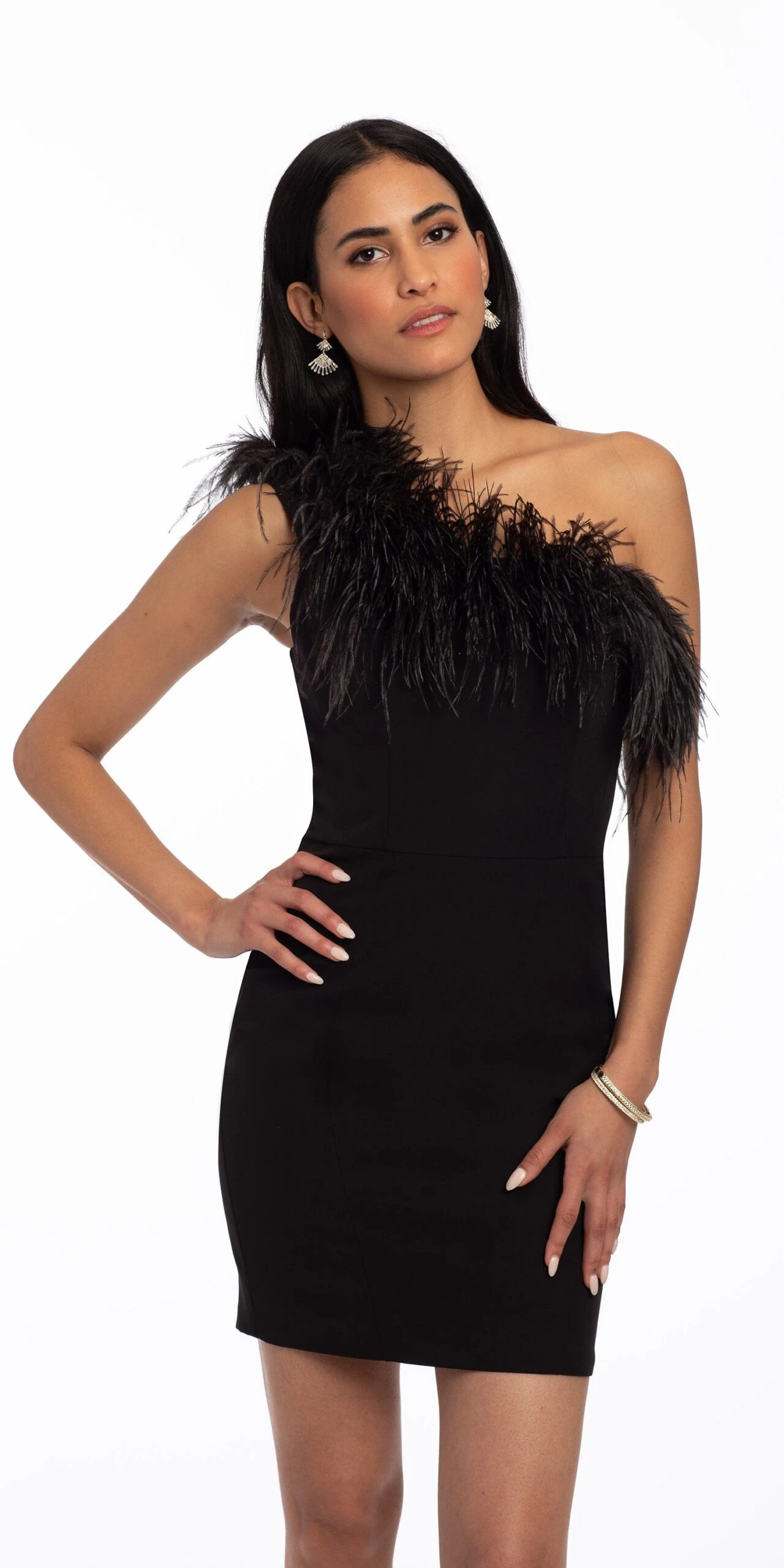 RSVP flirty and feathery style! This dress is perfect for your next cocktail party, evening event, wedding or homecoming! With its one shoulder neckline with feather detail, fitted bodice, sheath silhouette, and invisible zipper. Take on the night with this statement dress paired with silver accessories!