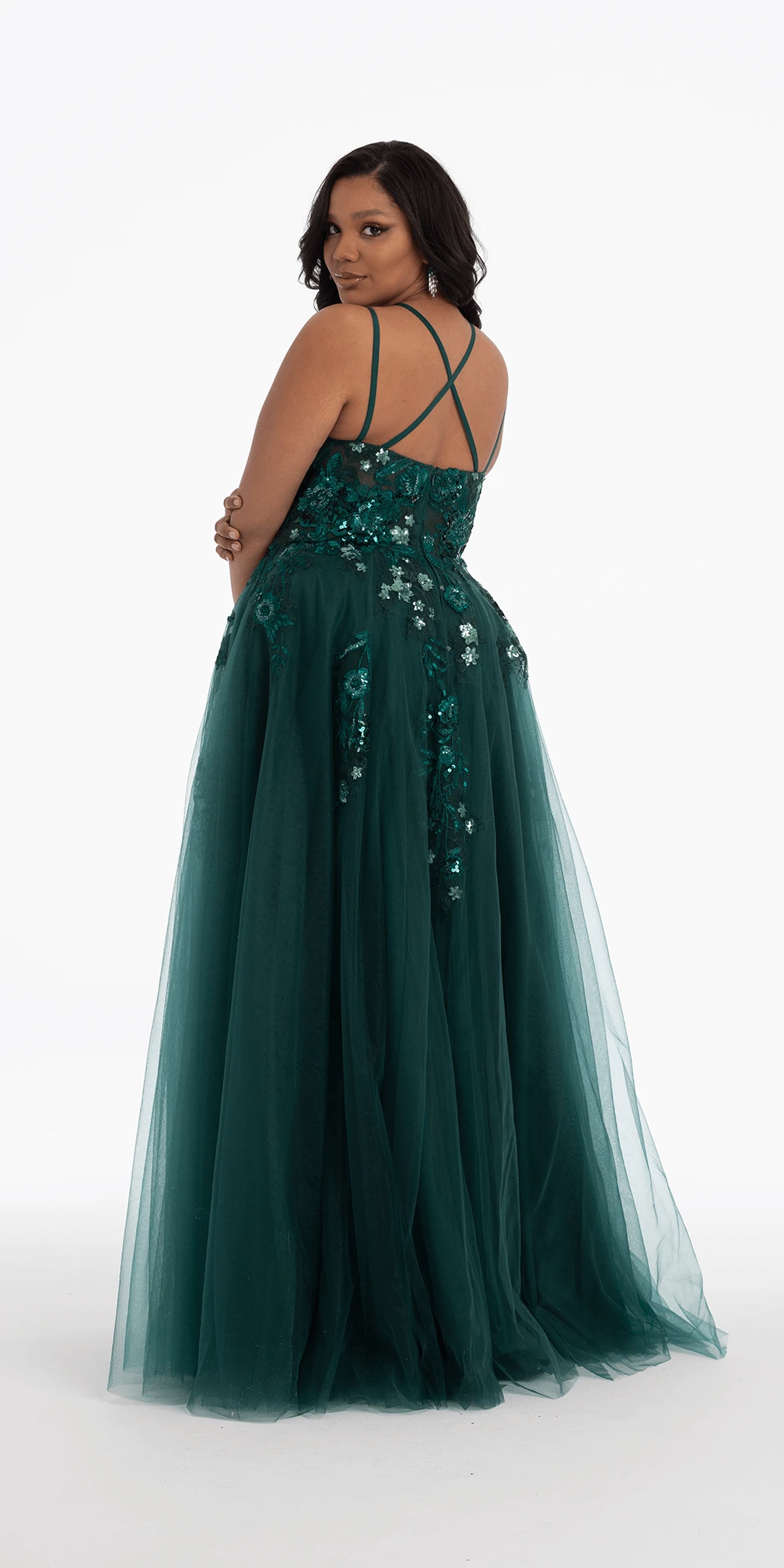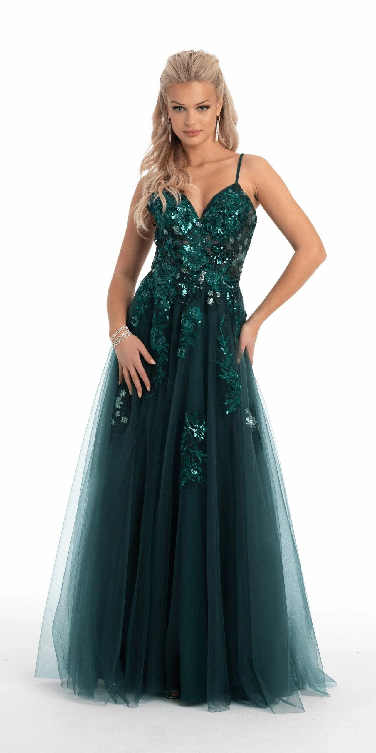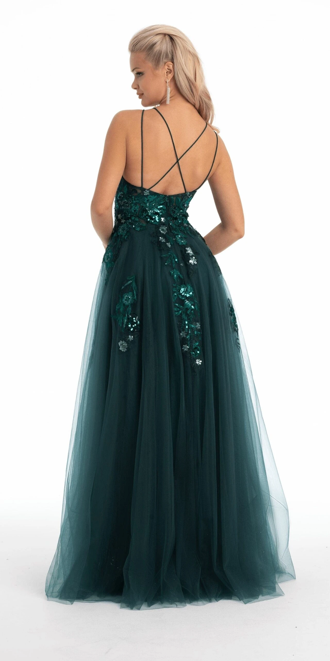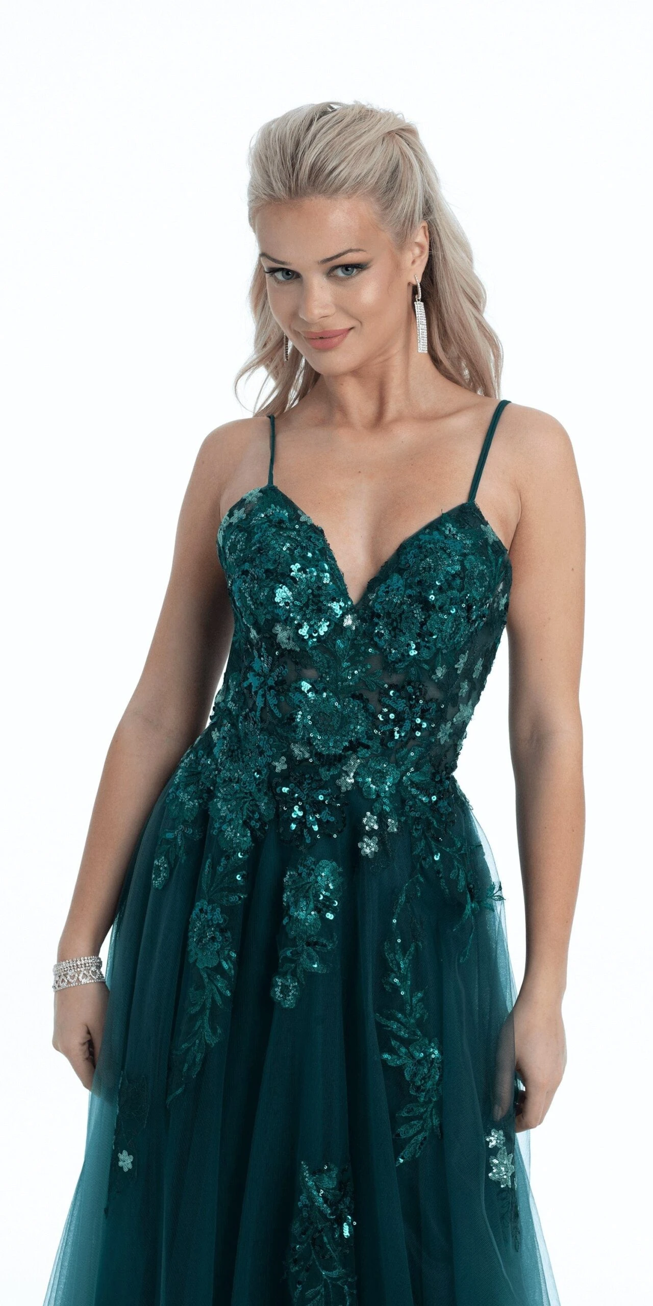 The emerald beauty has entered the scene! This tulle dress features a sweetheart neckline with spaghetti straps, fitted floral sequin bodice, ballgown silhouette, and criss cross back. Have your princess moment in this dress at prom, an evening event, or gala!Â