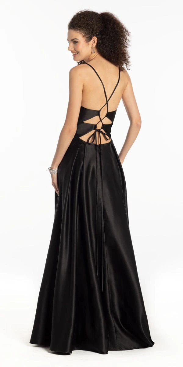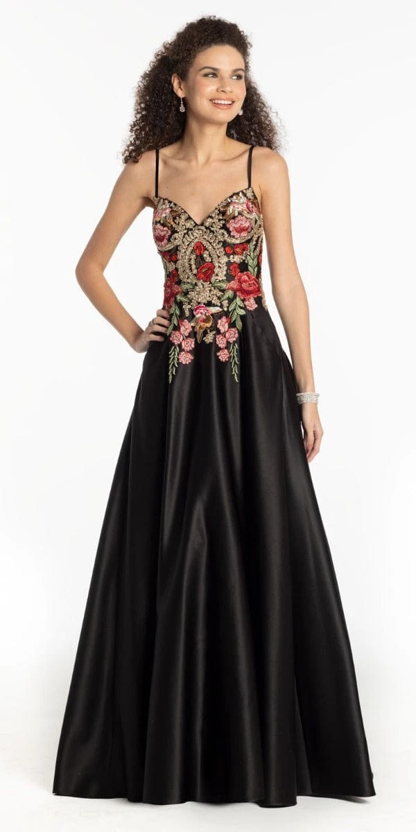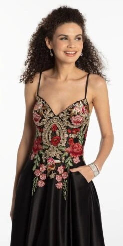Floral feels in this dress! This Satin Ballgown with Pockets features a sweetheart neckline, embroidered fitted bodice with floral detail, and double keyhole back with tie. Twirl all night long at prom, an evening event, or gala!Â