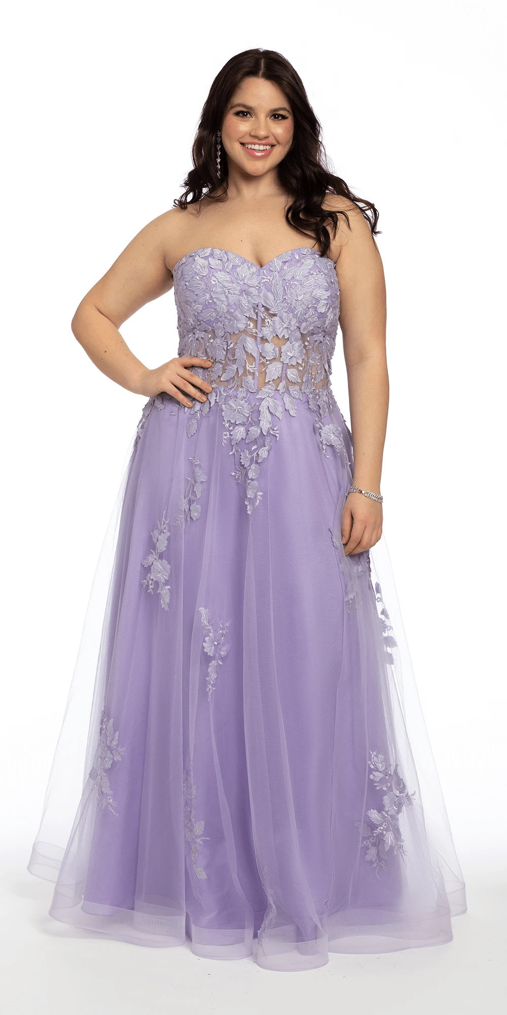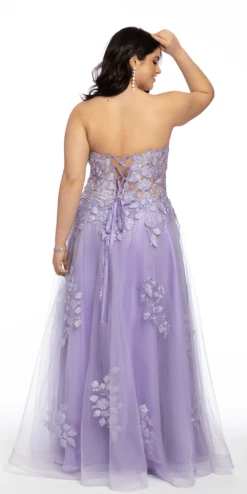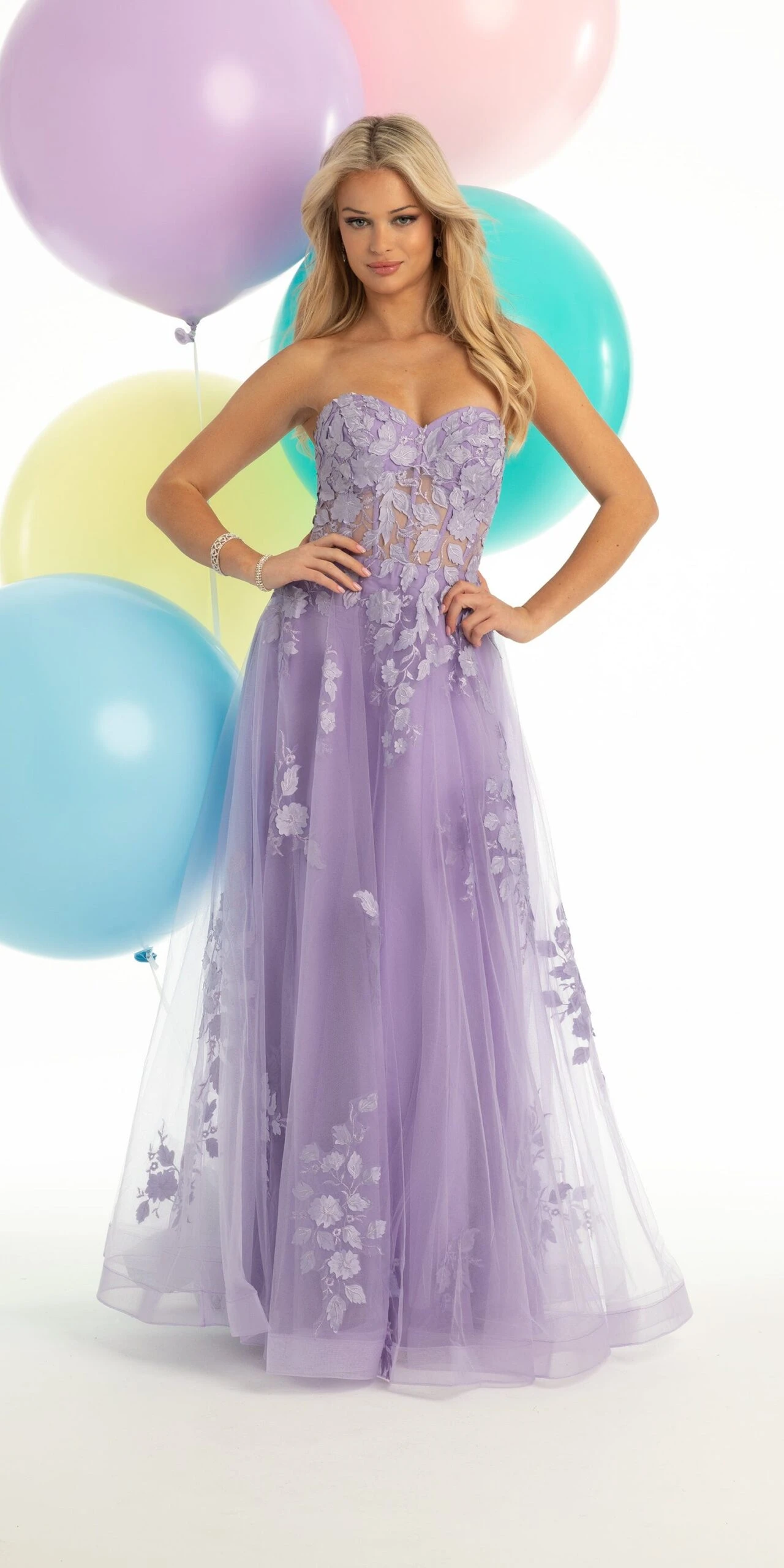 A gown that will leave them speechless. Adorned with gorgeous flower appliques. This dress also features a strapless neckline, fitted embroidered bodice, a-line silhouette, and lace up back. Steal hearts in this dress at prom, an evening event, or gala!Â