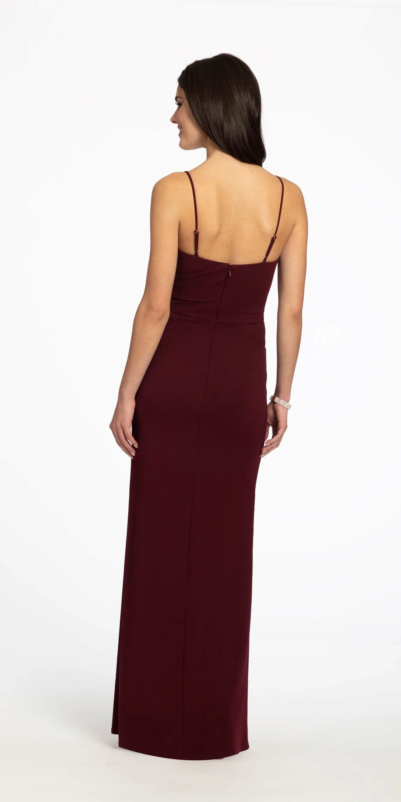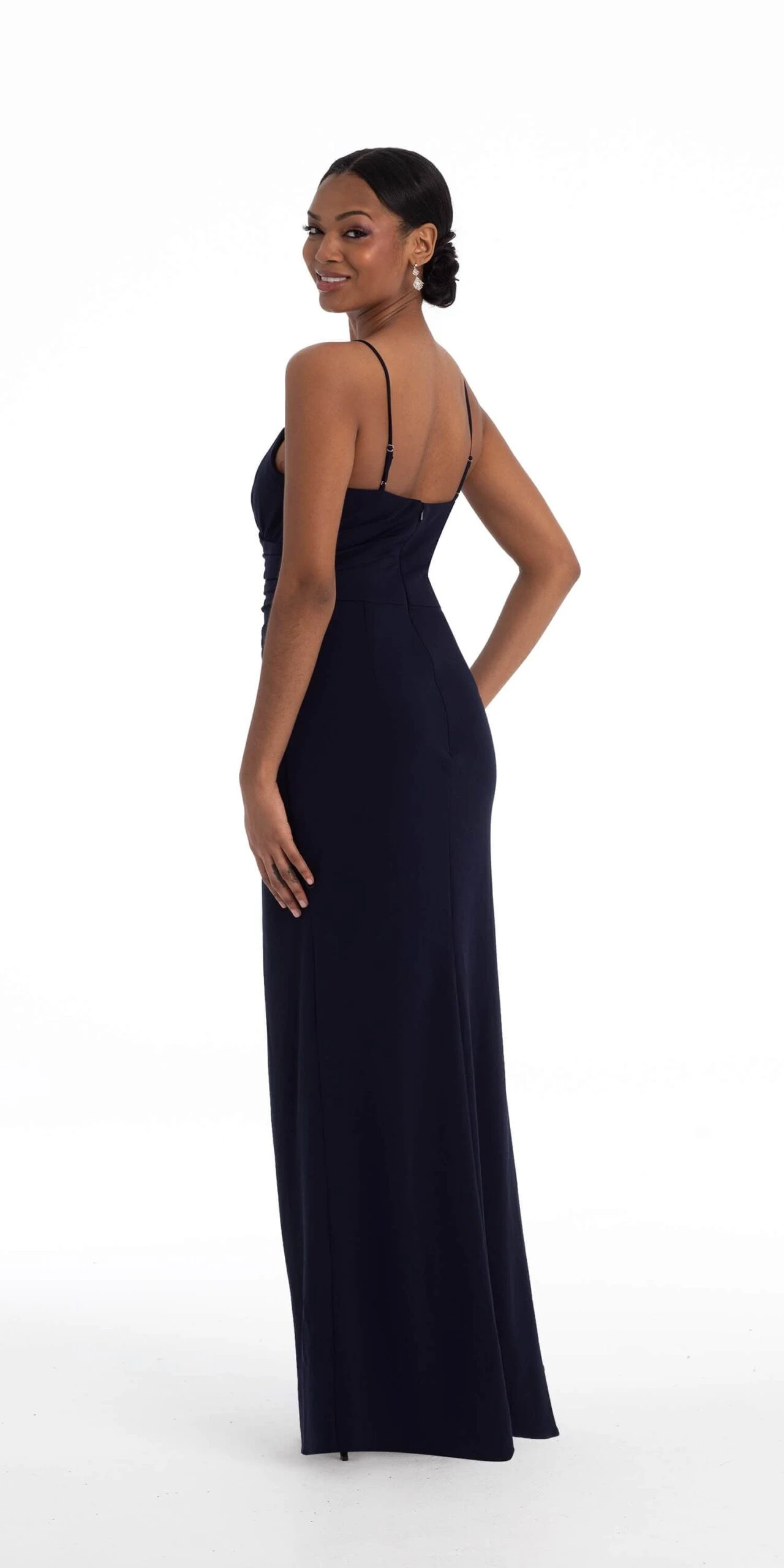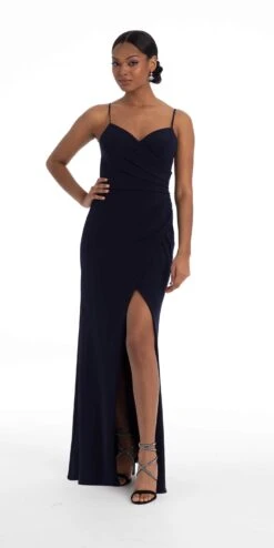 This simple elegant dress is perfect for any special occasion. Its classic silhouette and stretch fabric will make you look and feel good. This style features a sweetheart neckline, fitted bodice with ruching, crepe column skirt with front slit, and open back. The perfect dress for a wedding, evening event, or prom! Add sparkly accessories to glam up this look!