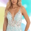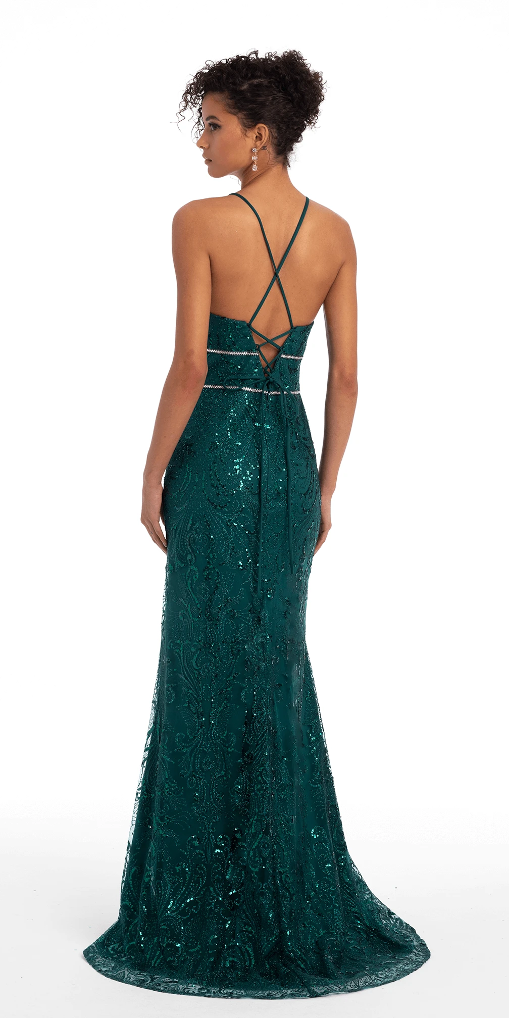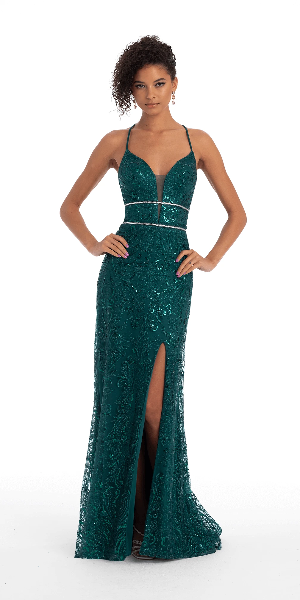 Glitter Plunging Lace Up Back Dress With Rhinestone Waist