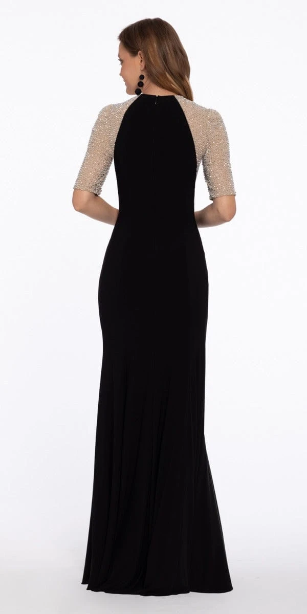 Illusion Beaded Short Sleeve Jersey Trumpet Dress