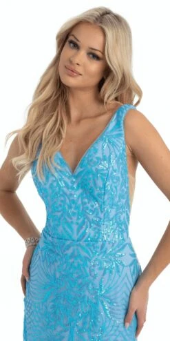 Oh what poise in turquoise! This jaw dropping dress features a plunging neckline, fitted bodice with side mesh panels, mermaid silhouette, and v open back. Make your debut at prom, an evening event, or gala!