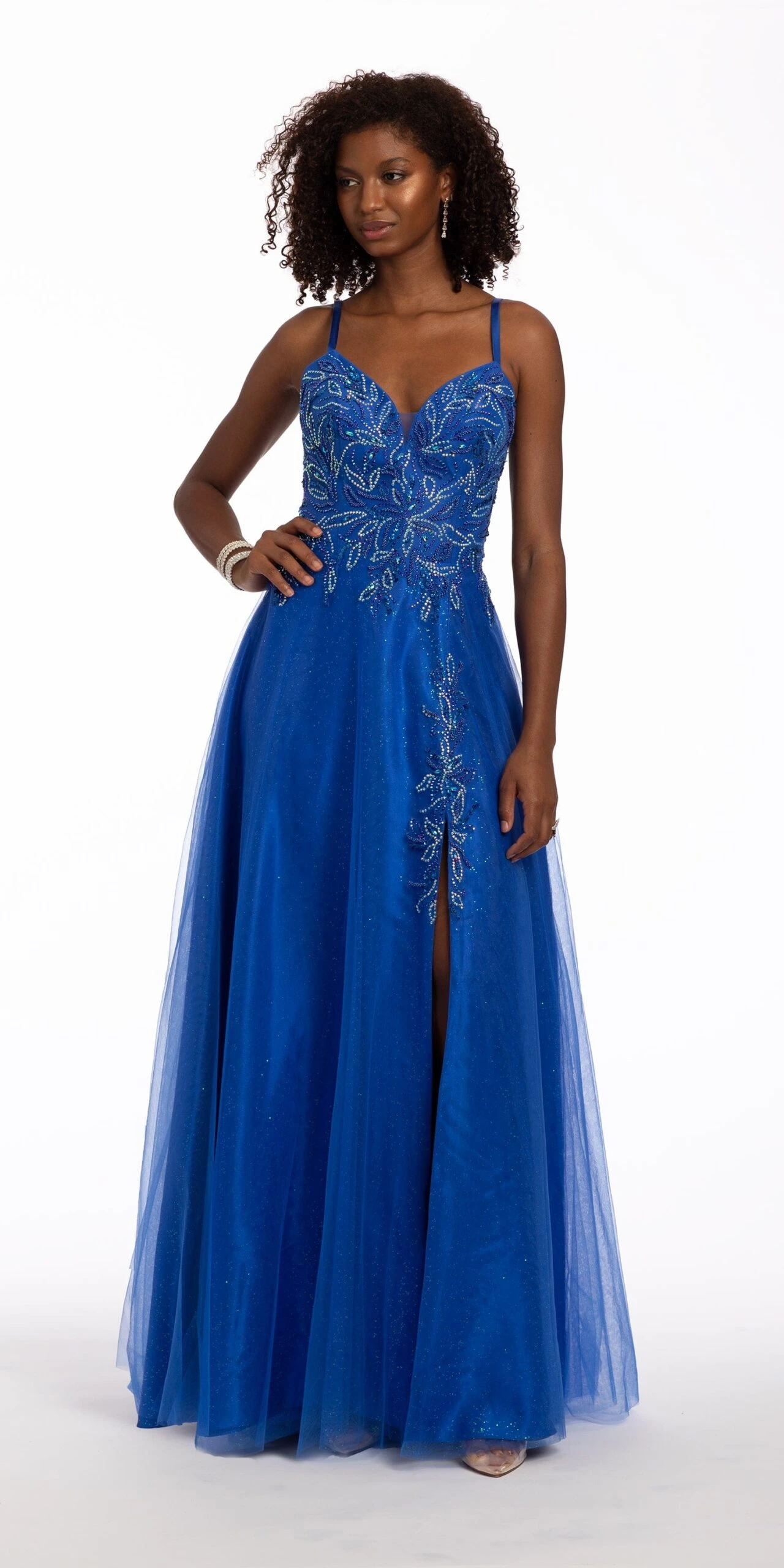 Make your evening as enchanting as this dress! With its plunging neckline, iridescent beaded bodice, ball gown silhouette, and open back. This royal blue number is perfect for prom, an evening event, or gala! Dress this up with silver accessories.