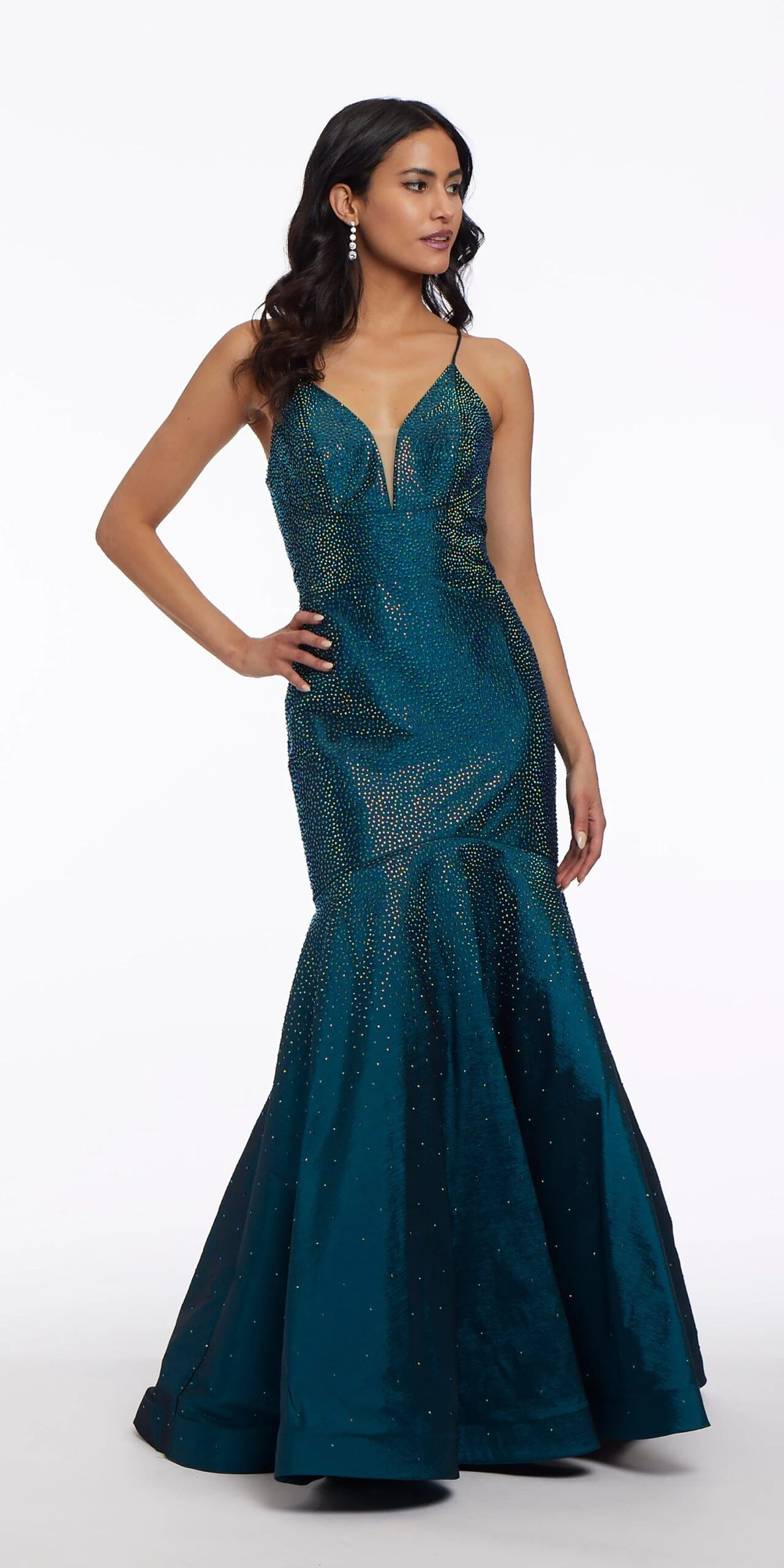 Iridescent Heatset Stone Lace Up Back Taffeta Mermaid Dress