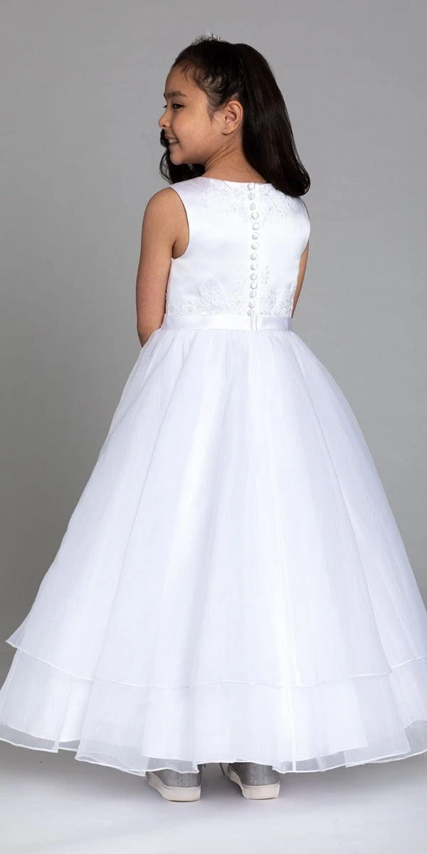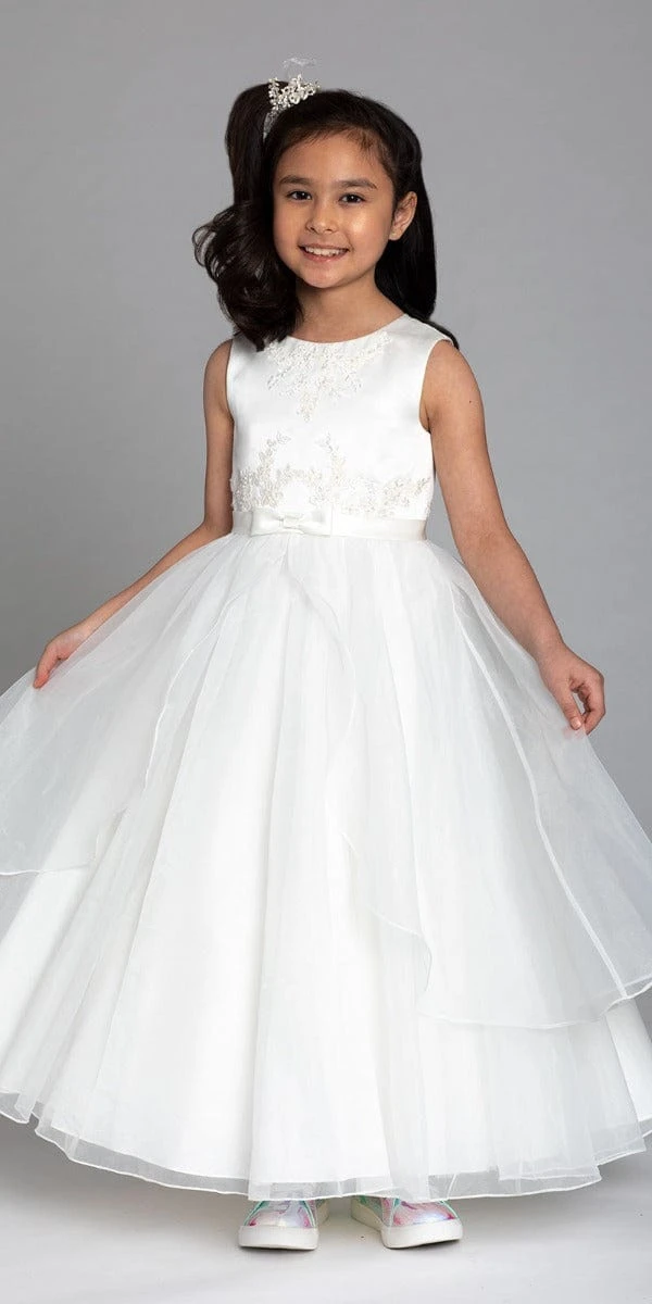 Pretty little princess! This Jewel Neck Satin Organza Dress features a jewel neckline, sleeveless, covered back with zip closure, and bead embellished embroidery. Shop this look for your flower girl on your wedding day!Â
