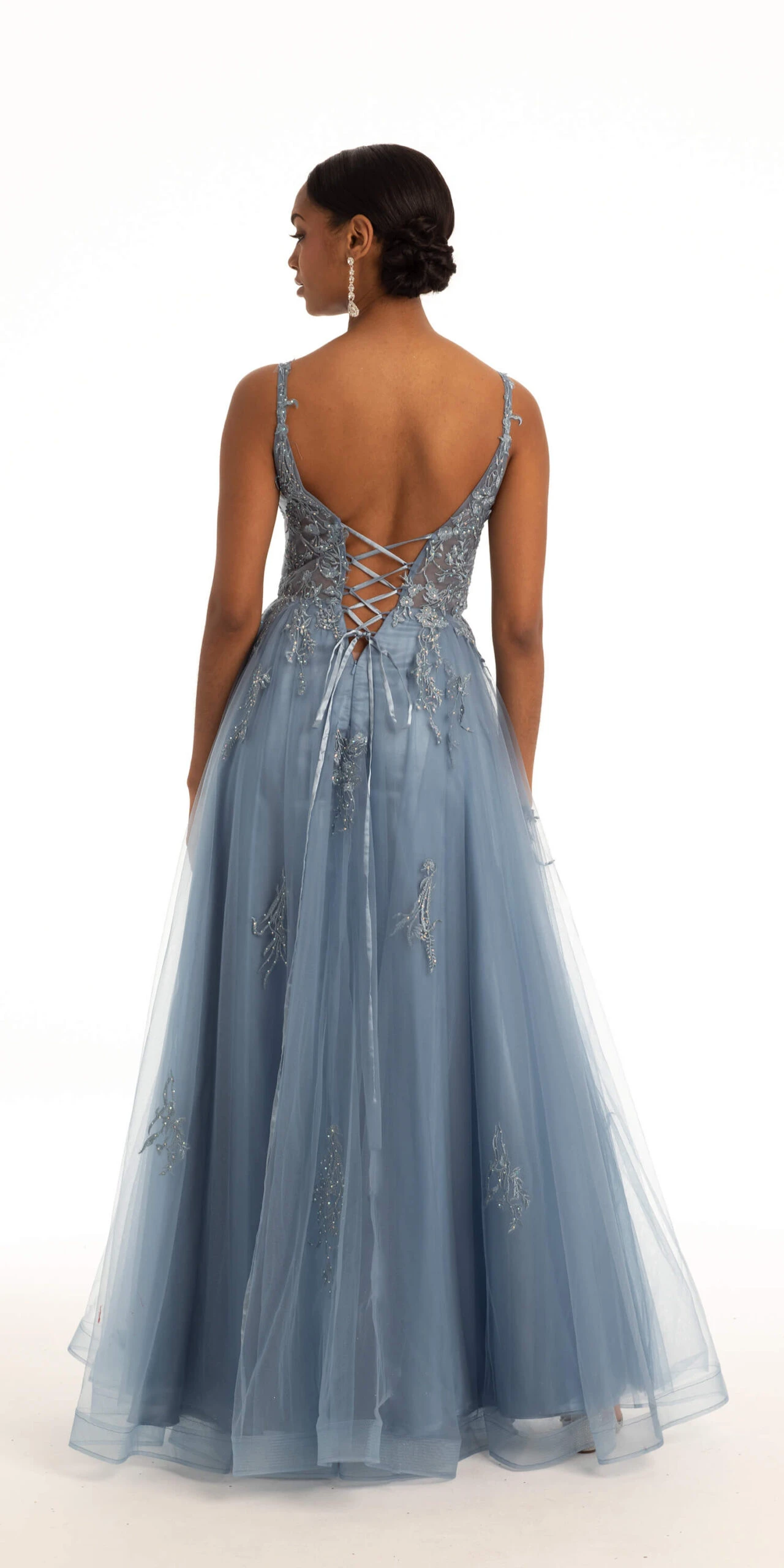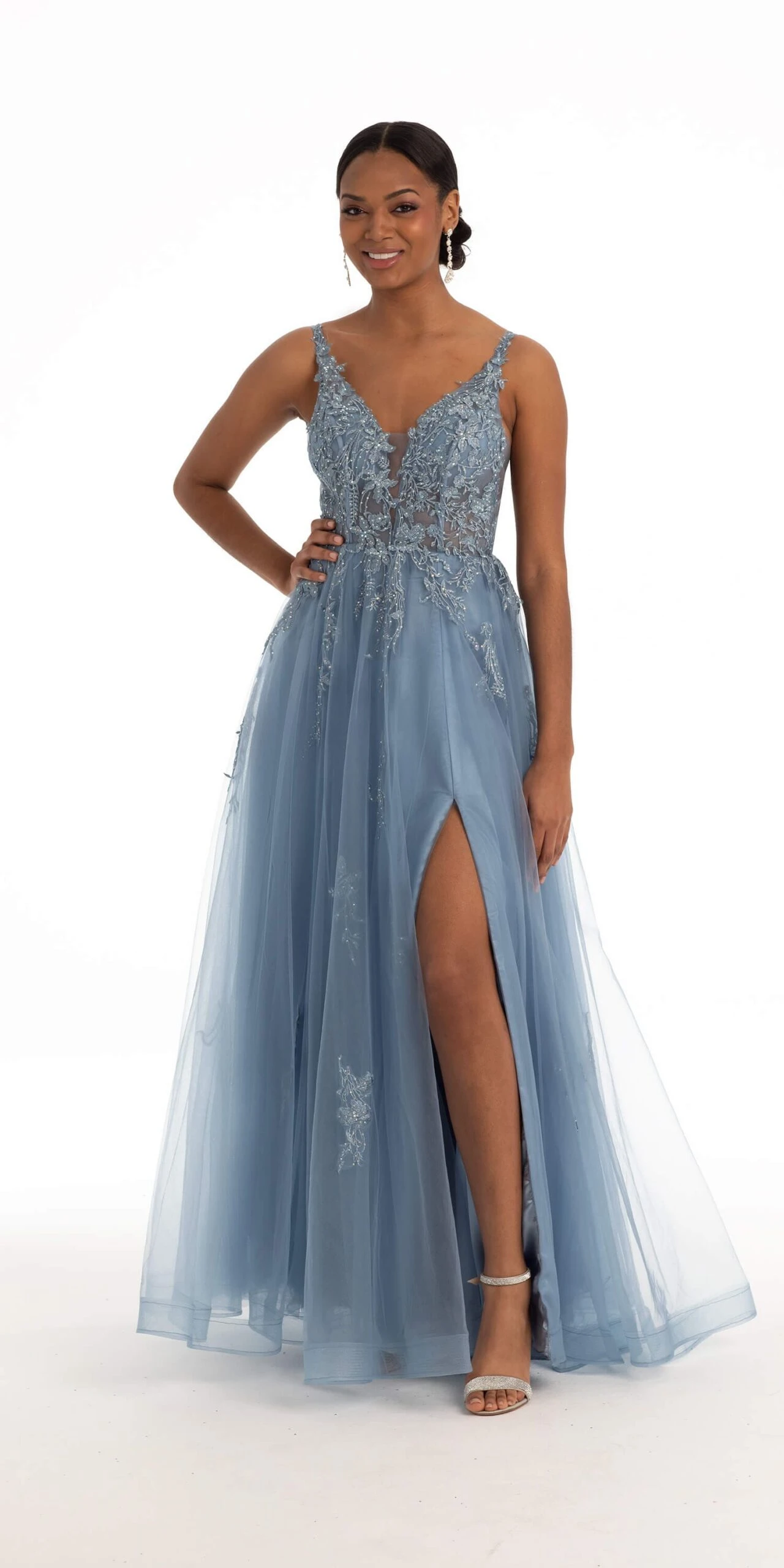 Head to your next evening event in total style with this Mesh A Line Dress! Luxuriously crafted with a plunging neckline, this dress flatters your figure while the fitted bodice adorned with lace appliques adds an extra touch of sophistication. Its A-line skirt further enhances its glamorous shape, while the side slit shows just the right amount of skin. To top it all off, an eye-catching laceup back. Wear this style to prom, or a wedding!Â
