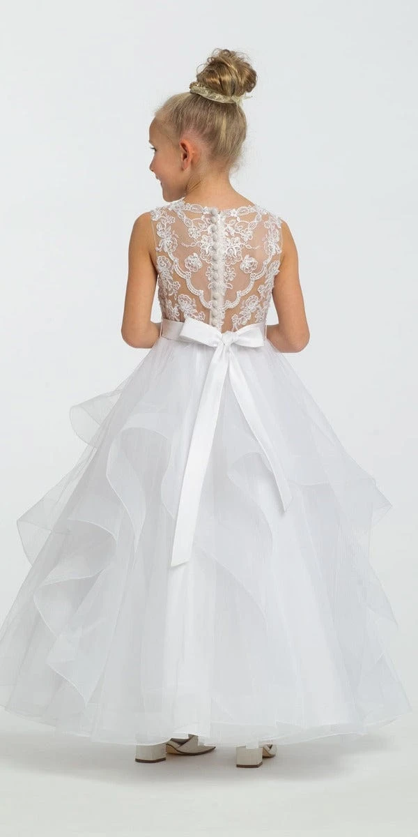 The perfect little princess style! This Lace Illusion Horse Hair Tulle Dress features a jewel neckline, fitted bodice, and flare tulle skirt. Style this on your flower girl for your wedding day!Â