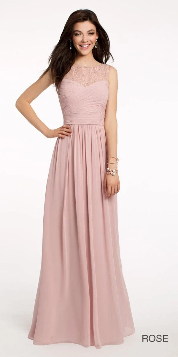 If your a bride who’s in LOVE with lace, we have the best bridesmaids dress pick for you! Go with this beautiful lace-embellished bridesmaids dress for a chic look to match your lace theme perfectly. Since you are wearing delicate lace as well, this sleeveless dress will be perfect for the girls that will be by your side all day long! This floor-length evening dress is complete with a lace illusion neckline, crisscross pleated bodice, chiffon skirt and a center back zipper! All they’ll need to finish the wedding day look is a pair of high heels, a bold bracelet, and a clutch!