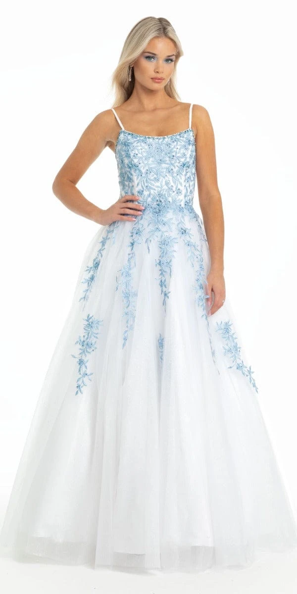 The ice princess! This Lace Up Back Glitter Tulle Embroidered Ballgown features a square neckline with spaghetti straps, fitted floral embroidered bodice, ballgown silhouette, and lace up back. This stunning style is ready for prom, an evening event, or quinceanera.Â