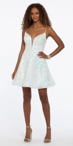 Take on the night in sequins! This dress features a plunging neckline with insert, fitted sequin bodice, fit and flare silhouette, and lace up back. This style would make the perfect homecoming, sweet 16, or cocktail party.