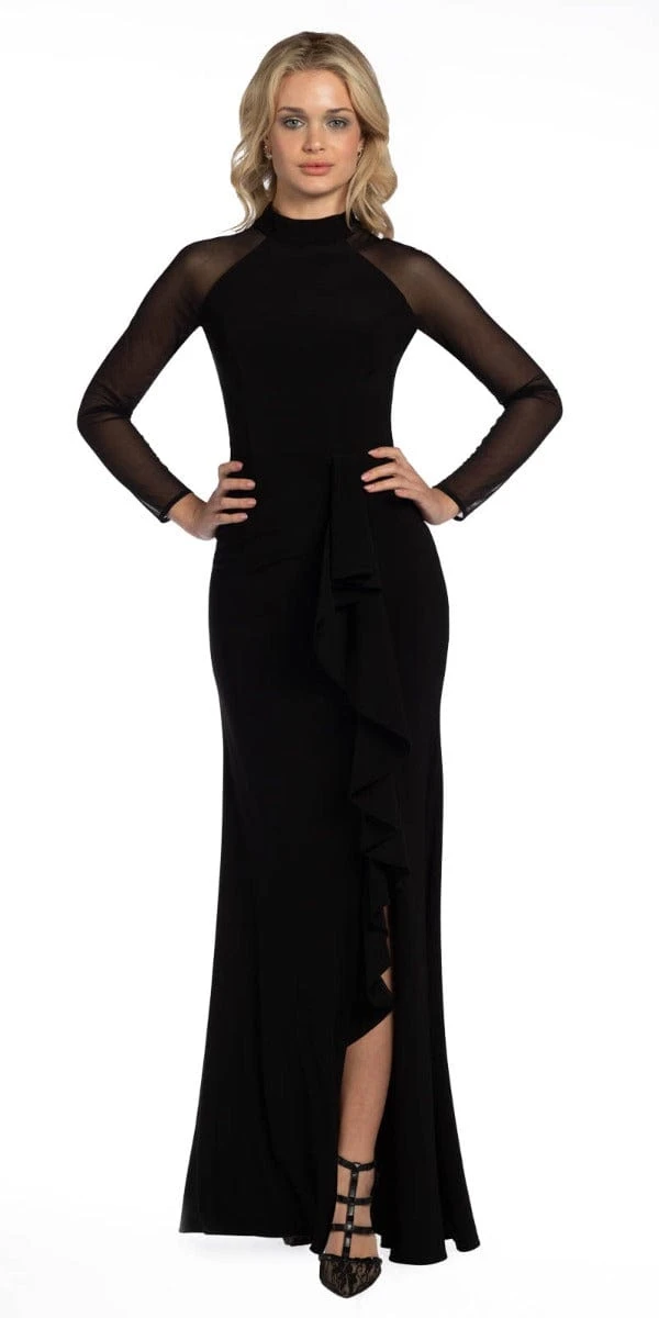 This Long Sleeve Jersey Dress with Side Cascade features a mock neckline, long illusion sleeves, and side slit cascade detail in the skirt. This dress is perfect for your next evening event or black tie wedding. Pair this with sparkly accessories to complete the look!