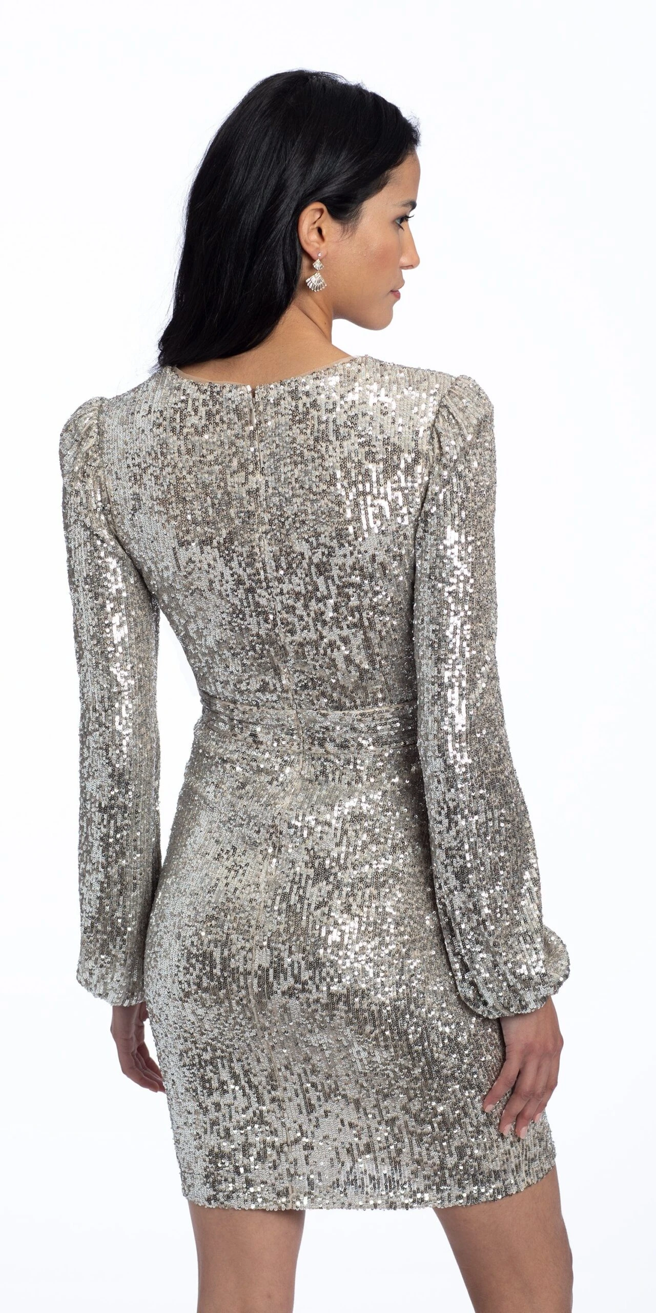 Light up the night in this glitzy dress. This dress features a v neckline, long sleeves, faux wrap surplice bodice, and covered back. This dress screams NYE! Also perfect for a holiday party, cocktail party, or date night!