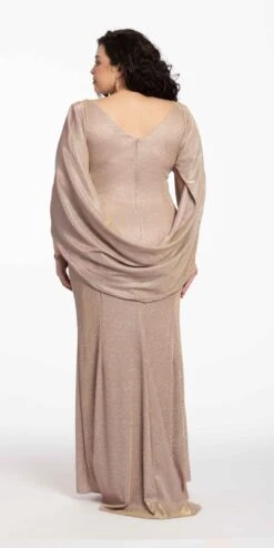 If elegance is the question, this metallic must have is the answer! Featuring a bateau neckline, V back, sheath silhouette and three-quarter drape back sleeves, this glitter jersey evening gown is both modest and utterly stunning. Take this look from gala to prom night with a simple swap of accessories (we’d suggest rhinestone and silver metallic shades or AB stone, all the way!).