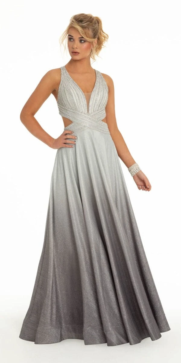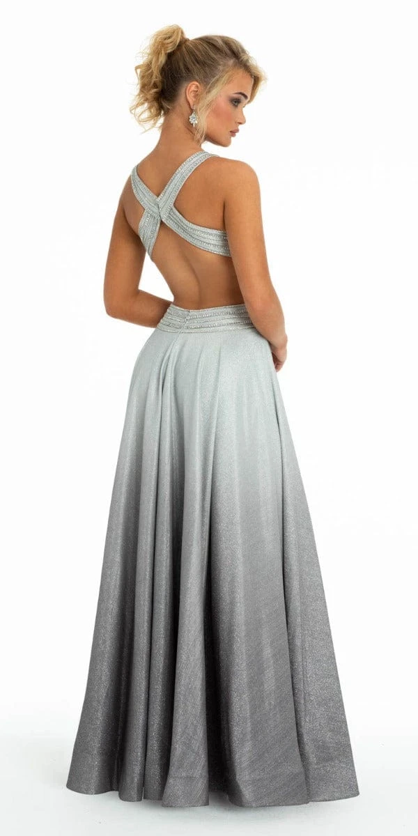 Your prom plans might be set in stone, but adding this metallic statement prom dress into the mix will take your most memorable night to the next level! Featuring a plunging neckline, rhinestone fitted bodice with side cutouts, an ombre A-line skirt and strappy criss cross back straps, this formal evening dress truly has it all. Accessorize with glitter flap satin clutch and high heel block rhinestone sandals.
