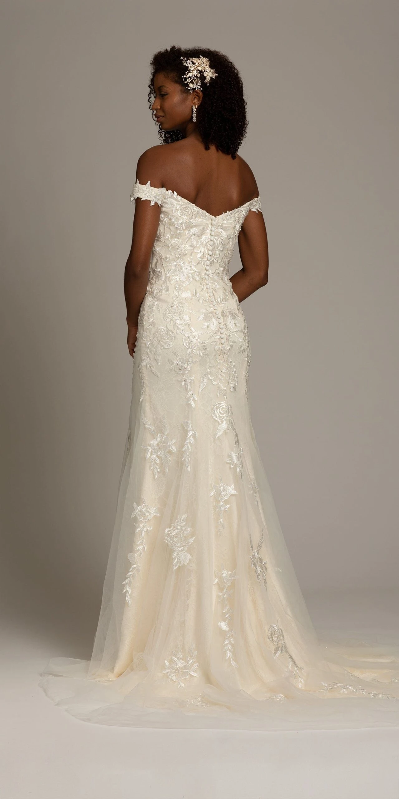 Where your dreams are made of mermaid silhouettes and embroidered details! This dress is a true dream with its sweetheart off the shoulder neckline, fitted floral embroidered bodice, mermaid silhouette, and semi open back with button detail. This dress is fit for your wedding day, but would not be complete without hues of jewel tones for your bridesbabes.