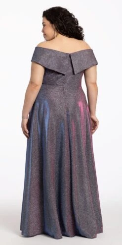 Two tone is better than one! This Off The Shoulder Surplice Two Tone Metallic Dress features a Off the shoulder neckline off the shoulder fold over sleeves, covered back with zip closure, and a-line skirt. Step into this dress for prom, an evening event, or wedding.Â