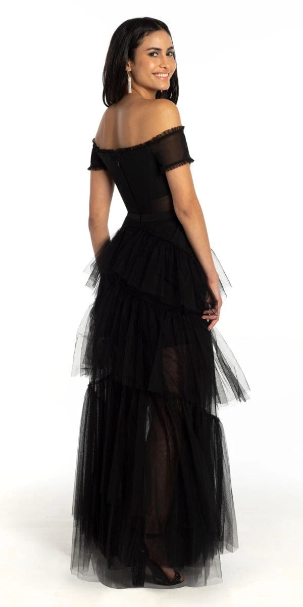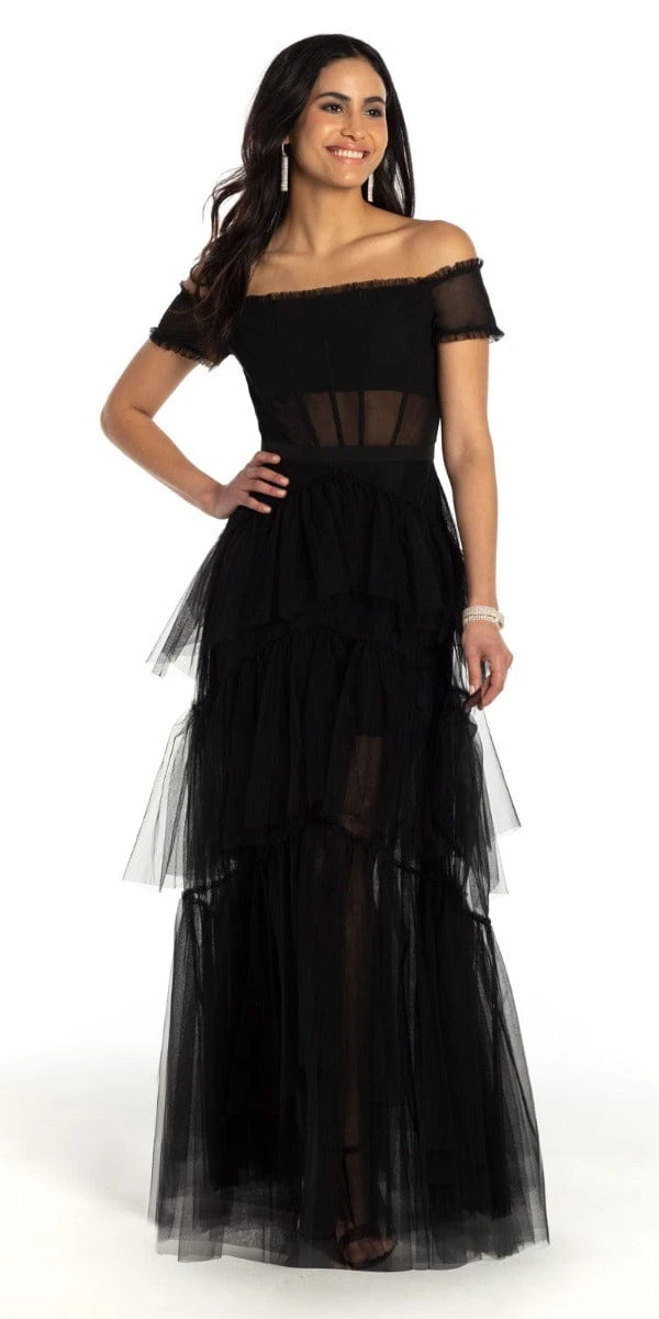 Talk about so many trends, so little time! This long prom dress captures all of the hottest looks this season; the fitted sheer corset bodice, tiered skirt, and off the shoulder neckline make this style a must for your closet! Also wear it as a wedding guest dress. Pair it with silver or black accessories to finish.