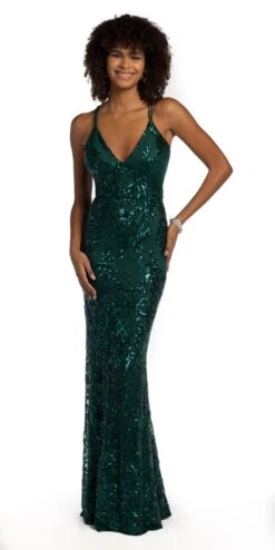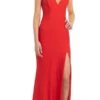 Look like an absolute movie star in this dress! With its deep v neckline, fitted bodice, high side slit, and double straps x open back. Stunning details from head to toe! This dress is ideal for prom, an evening event, or black tie event!