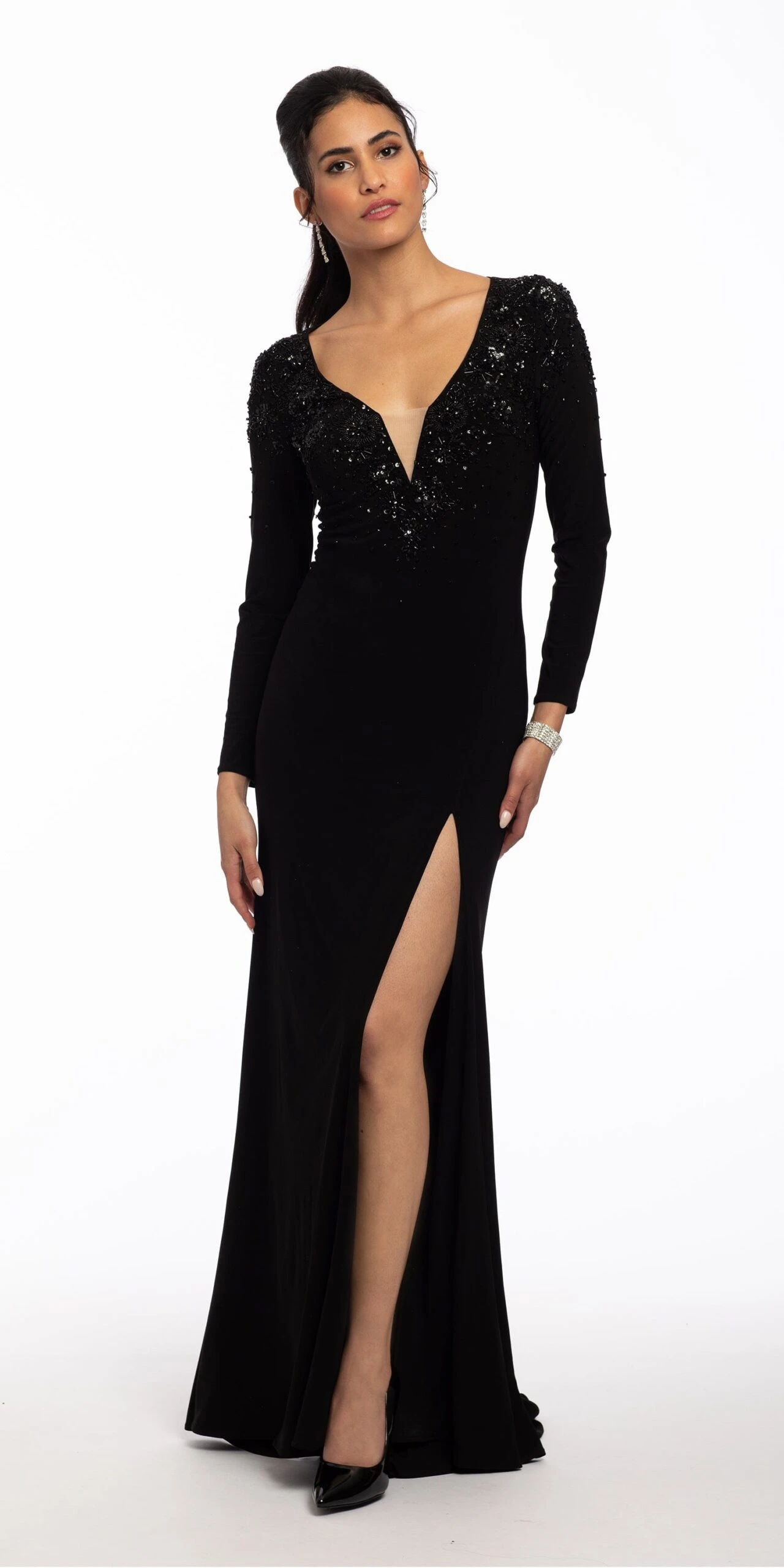 Romance in the air in this dress! With its plunging neckline with mesh insert, beaded fitted bodice, thigh high side slit, and covered back. A stunning look for mother of the bride or an evening event! Pair this with a pair of silver heels and a diamond clutch!