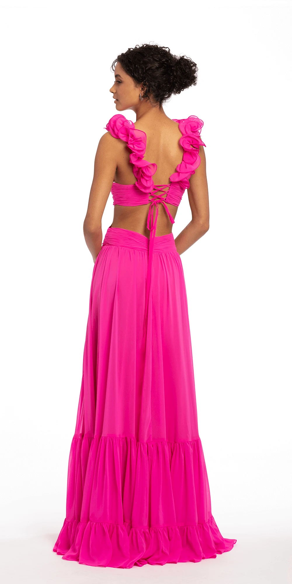 Ruched Chiffon Front Dress With Shoulder Ruffles