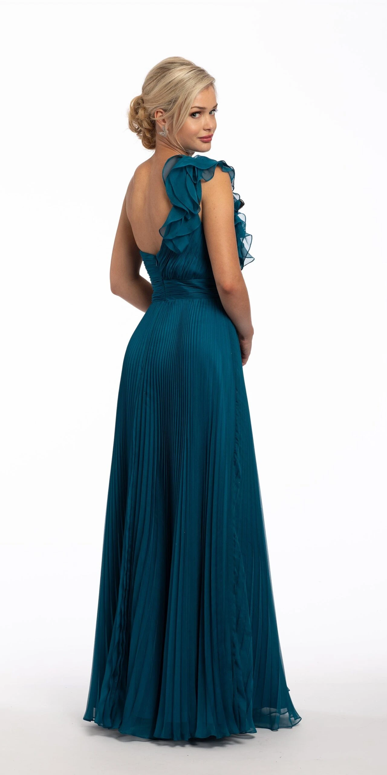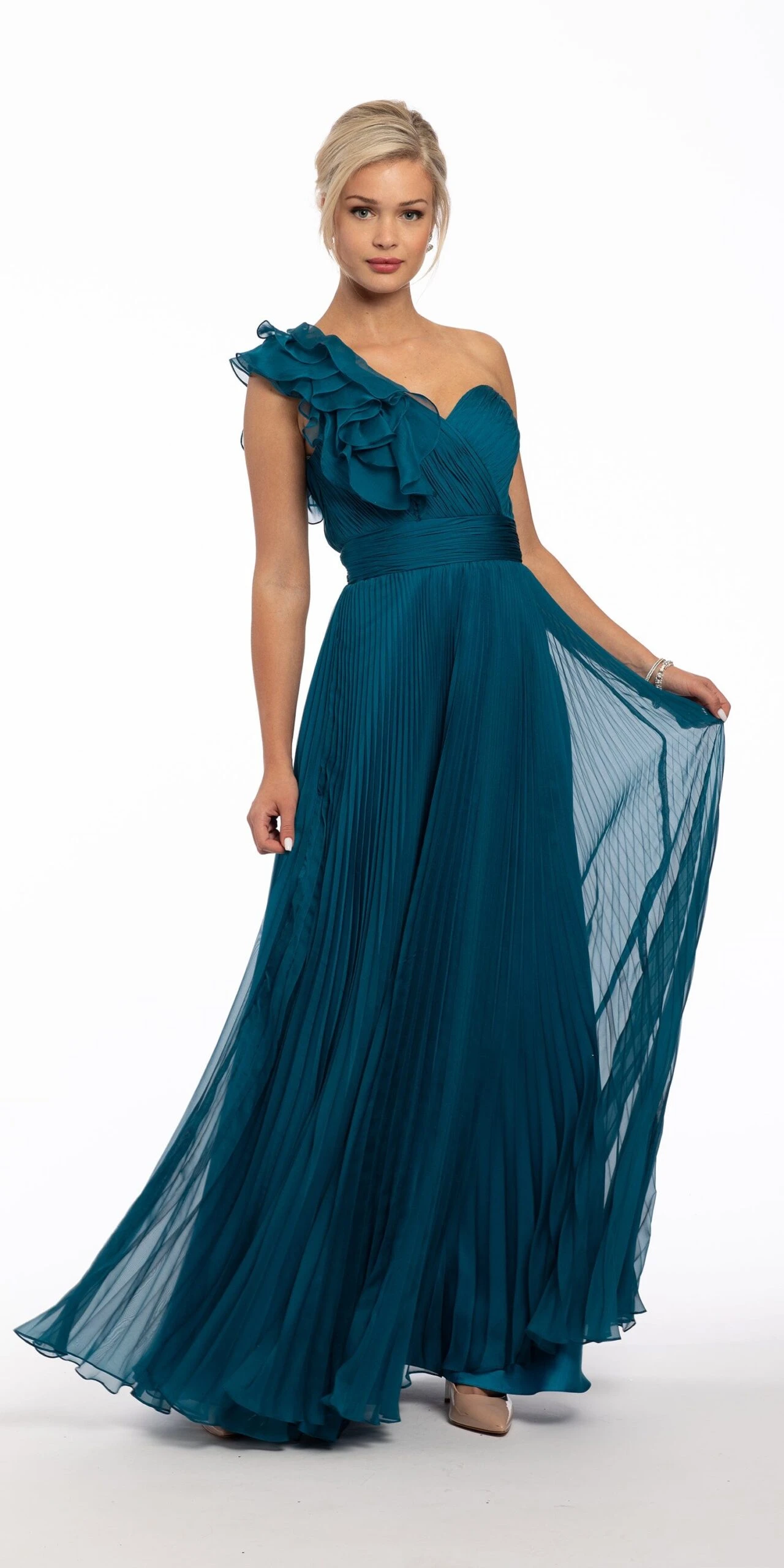 Pleats that are perfectly passionate! This free flowing dress features a one shoulder neckline, fitted bodice, a line pleated skirt, and center back zipper. The ideal dress for a wedding, prom, evening event, or cocktail party!