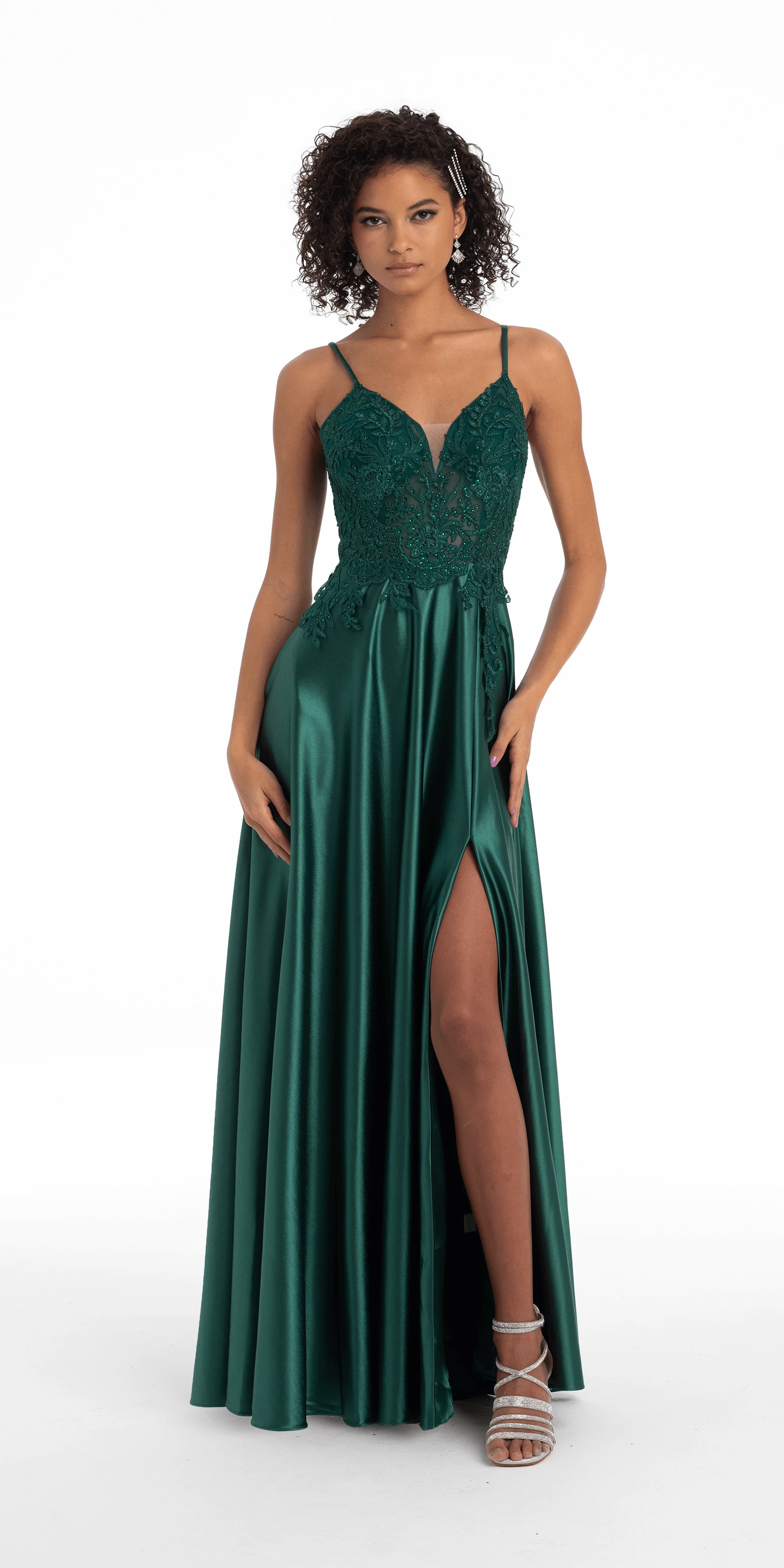 Get ready to stun all night long in this sateen dress! With its plunging neckline with spaghetti straps, floral embroidered bodice, a line silhouette with side slit, and v open back. This sophisticated style is the perfect fit for prom, an evening event, or wedding! Pair this with a strappy silver heel to complete the look!