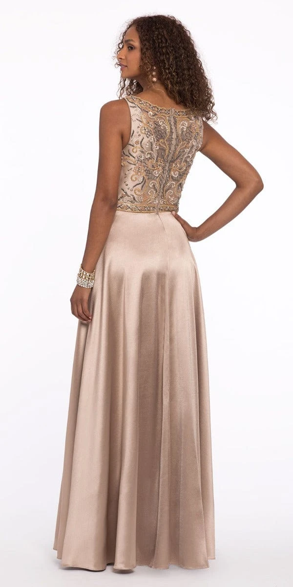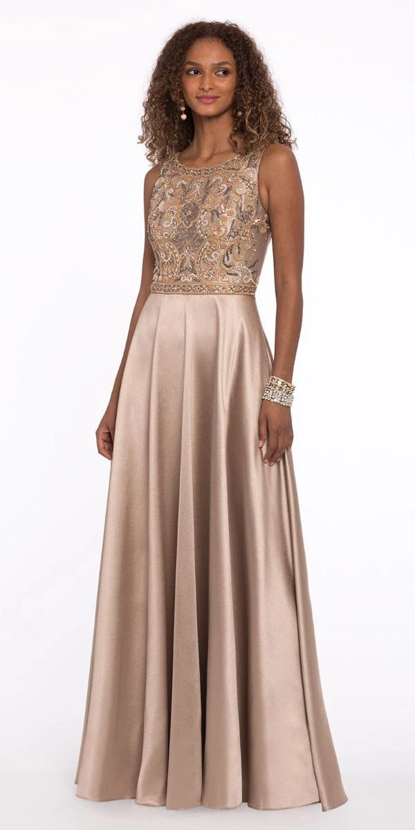 Elegance, redefined. This long evening dress is just waiting for a slow dance! The features of this style include a portrait neckline, stunning beaded bodice, satin A-line skirt, and illusion back. Perfect as a wedding guest dress or mother of the bride dress. Pair it with metallic jewelry, heels, and a clutch.