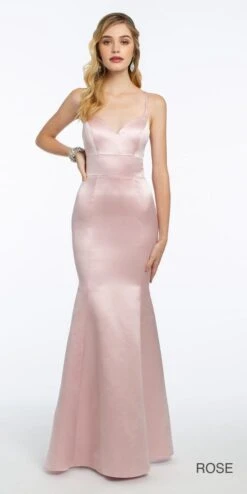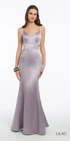 A trendy bride needs her leading ladies to look the part! This gorgeous satin bridesmaid dress features a sweetheart neckline with spaghetti straps, a fitted bodice, mermaid skirt and sexy open X back. Both regal and romantic, this chic silhouette, paired with rhinestone sandals and simple teardrop earrings, would look gorgeous next to an all over lace wedding dress.