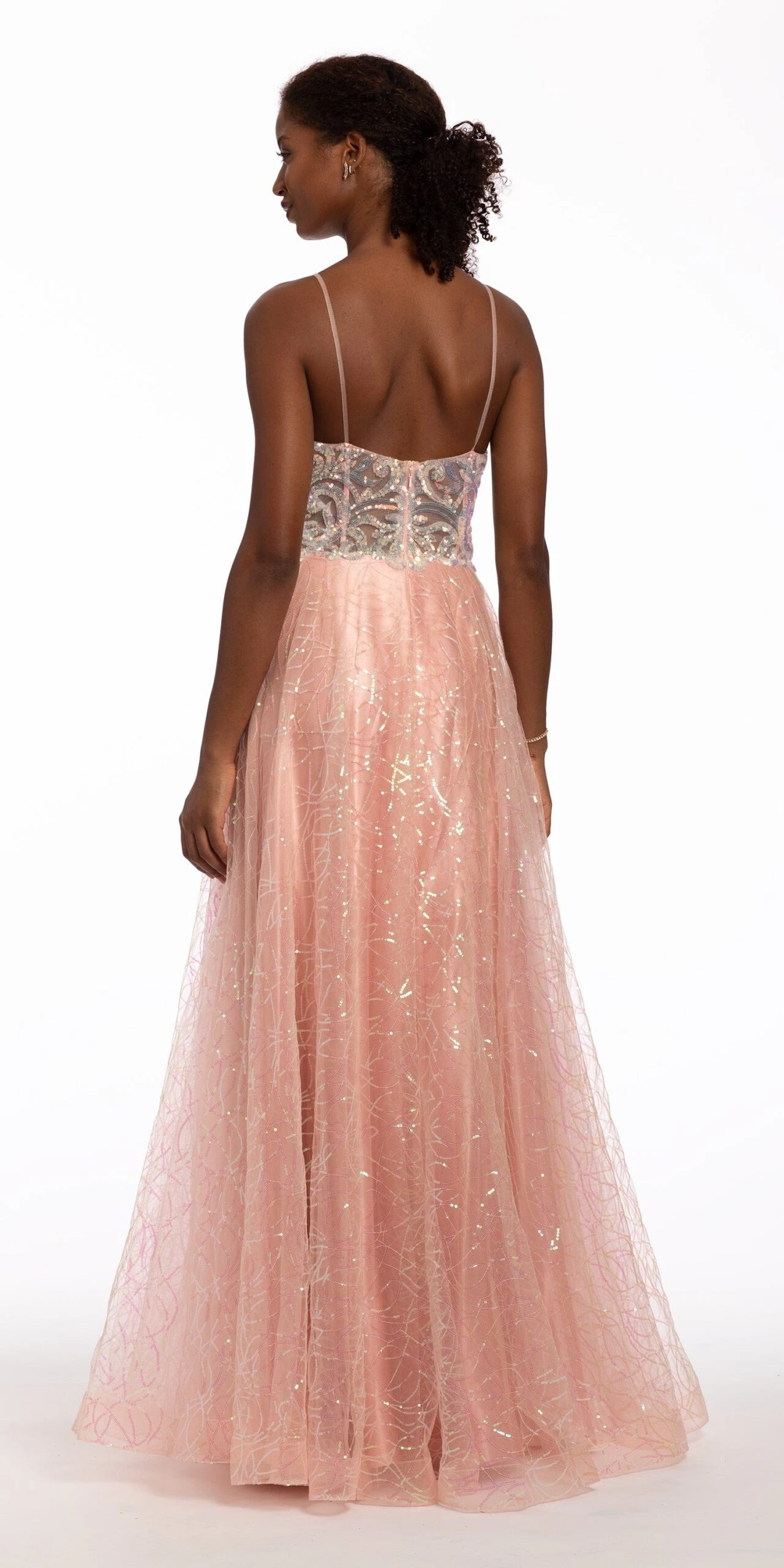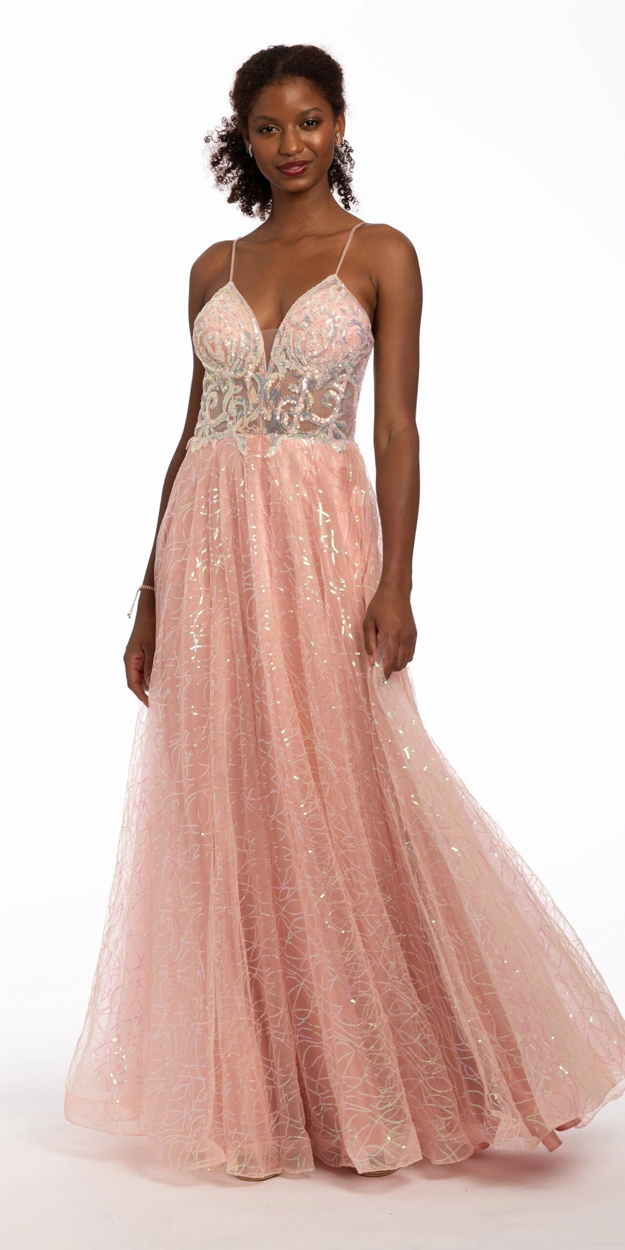 A corset moment is always a go! This sequin dress features a plunging neckline with mesh insert, fitted illusion beaded corset, a line silhouette, and illusion back. Be pretty in pink for prom, a wedding, or a gala! Add on silver accessories to complete the look!Â