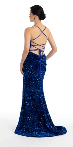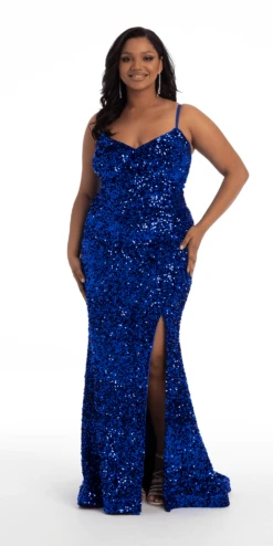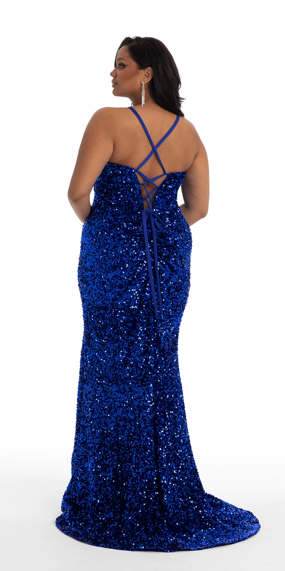 Dazzle them all in this figure flattering dress! Make people stop and stare wherever you go! This ultra flattering dress features a V neckline with spaghetti straps, fitted bodice, column silhouette with side slit, and lace up back. Slip into this royal look for prom, an evening event, or gala!Â