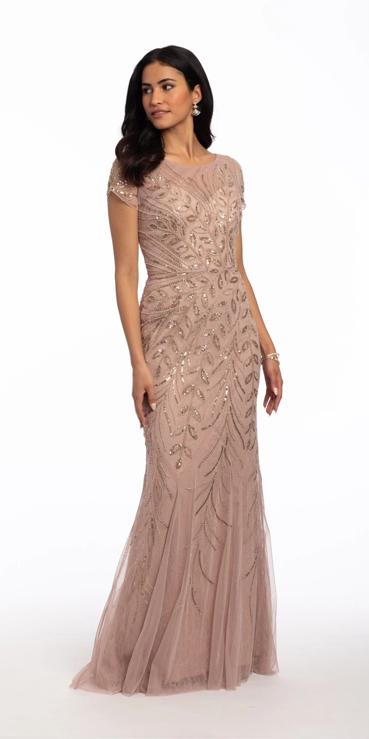 She is beauty and she is grace. This dress features an illusion jewel neckline, fitted beaded bodice, short sleeves, and cover back. This dress would make the perfect mother of the bride look! Pair this with a dazzling silver clutch and accessories.