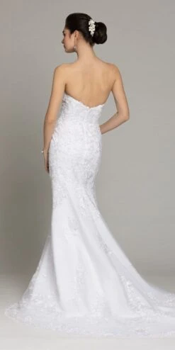 Float down the aisle in this elegant bridal gown that will leave them all with heart eyes: featuring a strapless sweetheart neckline, fitted embroidered bodice and mermaid skirt, take on the day of your dreams in a dress that captures your beauty and captivates the crowd. Dress your ladies in complementing petal pink bridesmaid dresses for a jaw-dropping leading lineup.