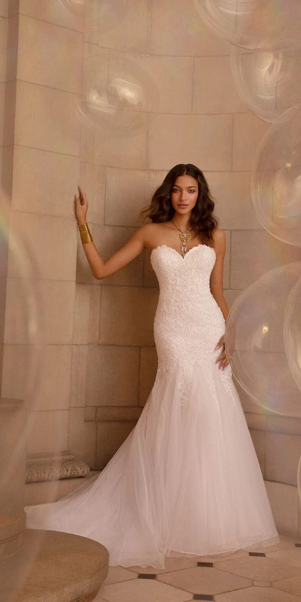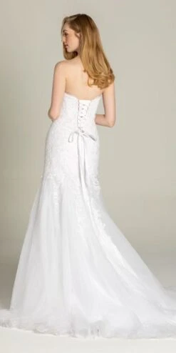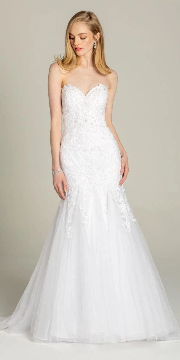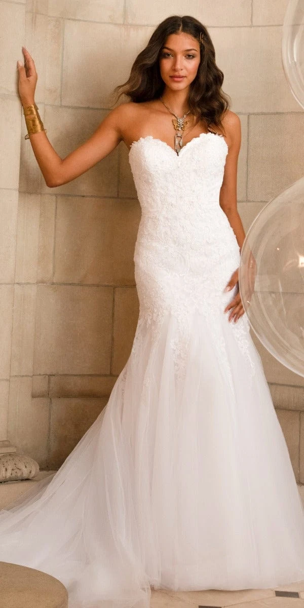 Perfect for any season, this strapless wedding dress is truly timeless. With its sweetheart neckline, fitted embroidered bodice, trumpet silhouette, lace up back, and tulle fabric, this wedding gown is ready for its debut down the aisle. Pairs perfectly with our bridesmaid dress collection!